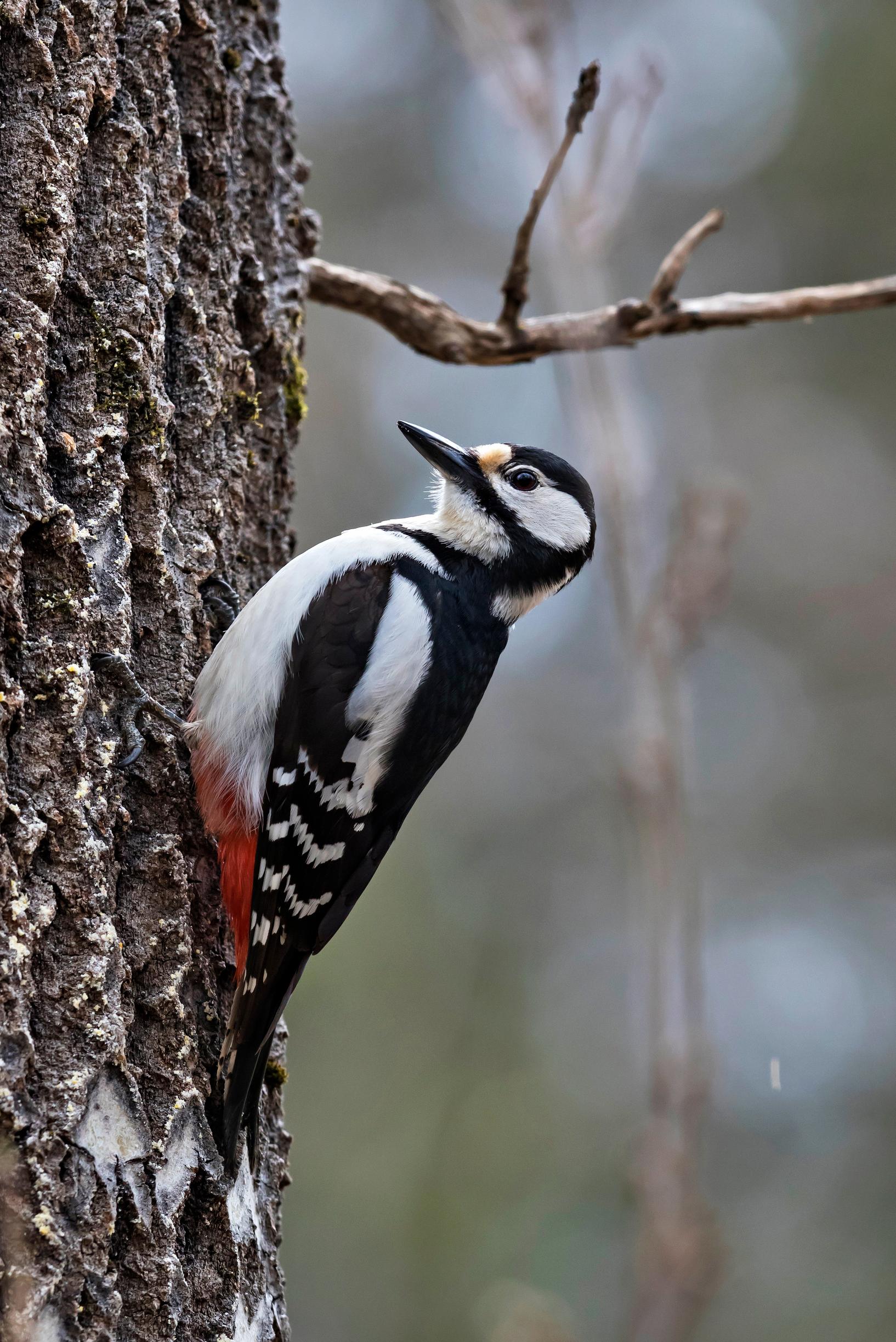 Metsänreunasta kantautuu kirkas ”kyk”- huuto. Käpytikka on tulossa syömään. Samassa ruokinnalle liitää mustavalkoinen, pitkänokkainen lintu. Se laskeutuu ruokinta-automaattia kannattavalle seipäälle ja kurkkii sen takaa tilannetta.