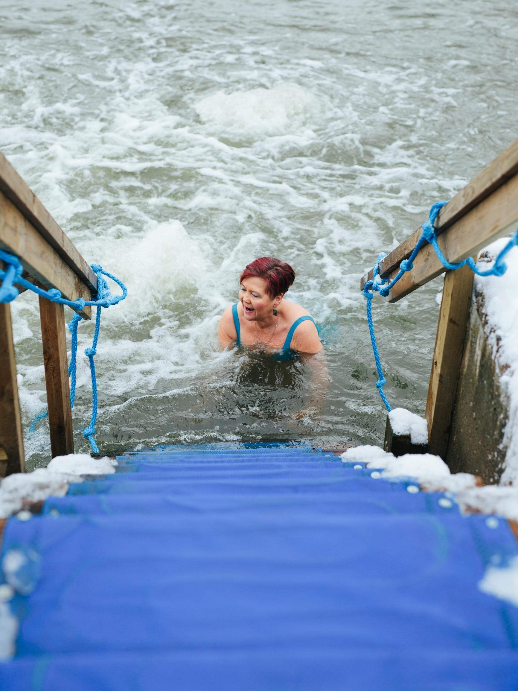 – Vesi on ehkä 1–2-asteista. Jos ilma on kymmenasteista, tulee vedessä ensin vähän kylmä mutta siihen tottuu. Pakkasella vesi tuntuu lämpimämmältä, Seija kertoo.