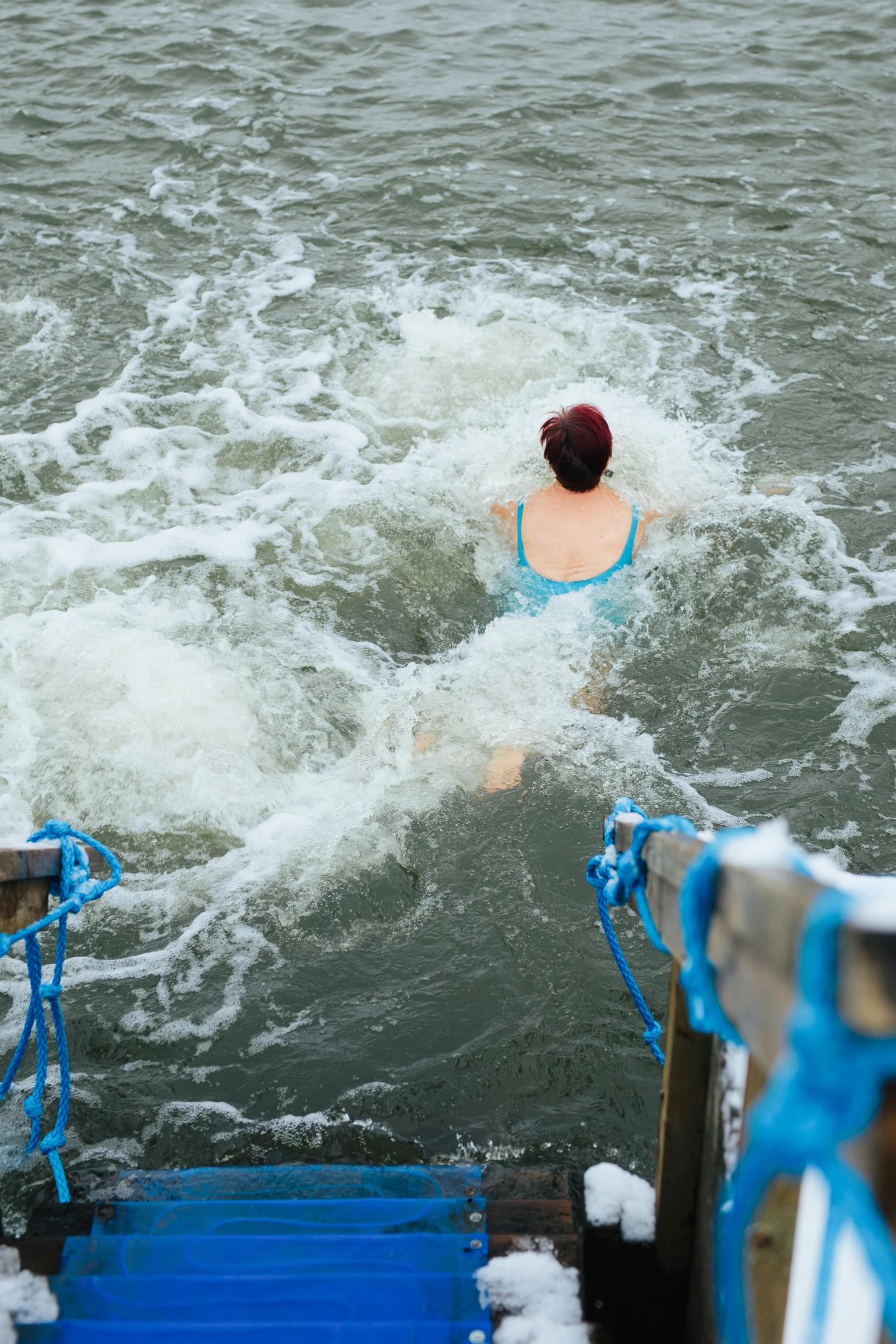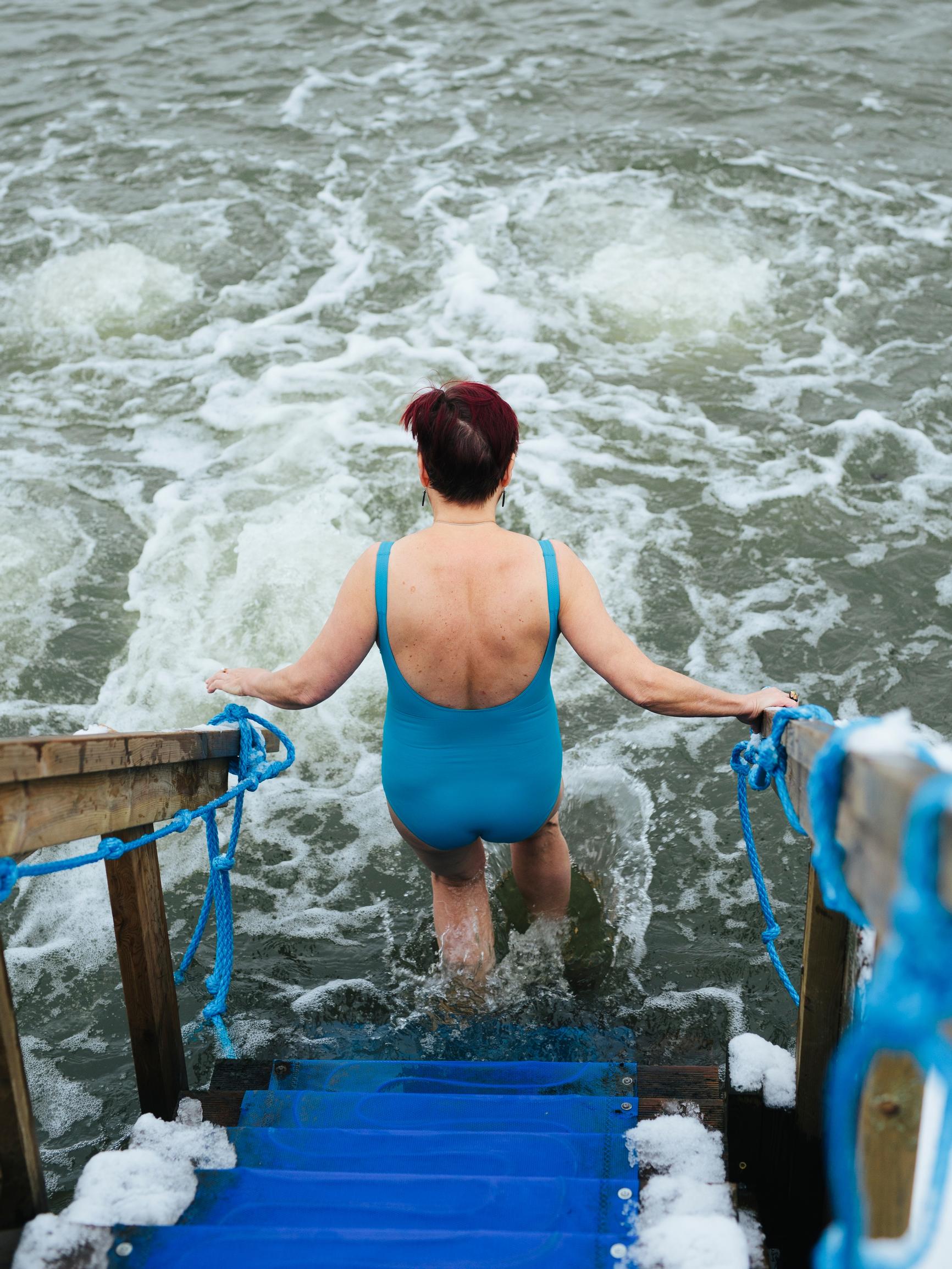 Seija Herrala, 62, on kävellyt tänne kotoaan parin kilometrin matkan. Hän marssii määrätietoisesti Venäläisten laiturille, riisuu pikkuruisessa uimakopissa toppapuvun ja ilmestyy laiturille uimapukusillaan. Hän ei arvuuttele hetkeäkään laskeutuessaan rappusia meriveteen, johon pumppu tekee reippaita poreita.