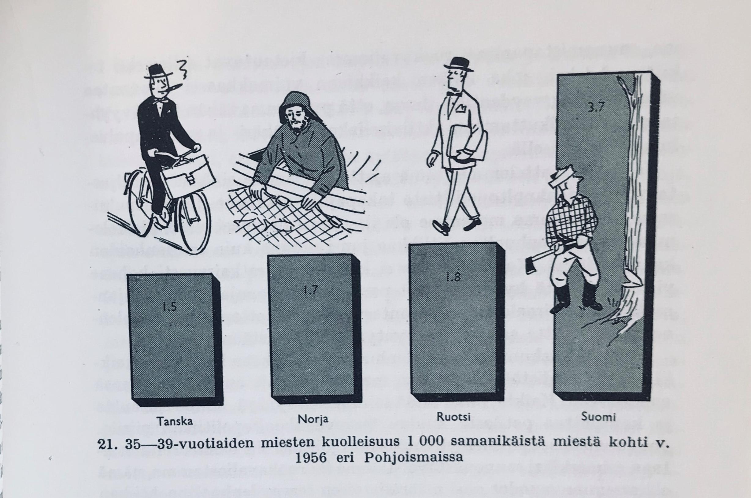 Suomalaisen miehen perikuvan, Jussi Koskelan tyyliin ei kuulunut vähäisten vikojen kuuluttaminen. Terveystilastot olivat karua katsottavaa. Suomessa 35–39-vuotiaiden miesten kuolleisuus oli Euroopan pahinta laatua.