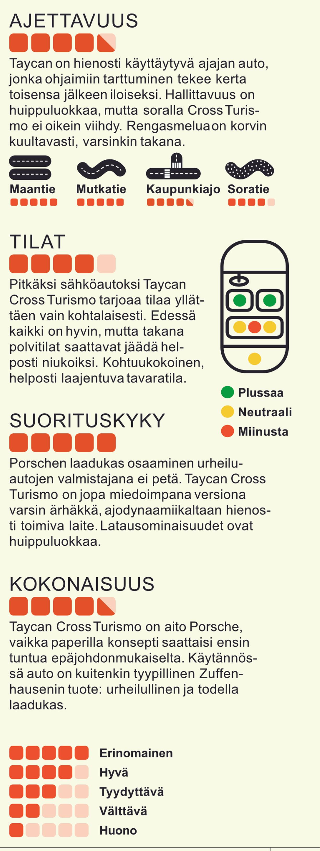 Toiseksi hätäisimmässä Taycan Turbo Cross Turismossa tehoa on jo 680 hv (500 kW), kiihtyvyys 3,3 sekuntia ja huippunopeus 250 km/h. Huippumalli Taycan Turbo S Cross Turismon huipputeho on huimat 761 hv (560 kW), kiihtyvyys 0–100 km/h sujuu 2,9 sekunnissa ja huippunopeutta kirjataan 250 km/h. Huippunopeutta lukuun ottamatta Porsche ei siis varsinaisesti tingi urheilullisesta imagostaan, ja Suomen tieliikenteessä jo edullisimman Cross Turismon suorituskykyarvoin sompailee riittävän sujuvasti. Kulkua riittää ja varmaa on, ettei tällä Porschella jalkoihin jää. Ajaessa voi se hymykin karehtia kuljettajan huulilla tavallista useammin. Taycan Cross Turismo on iloisen notkea kulkija.