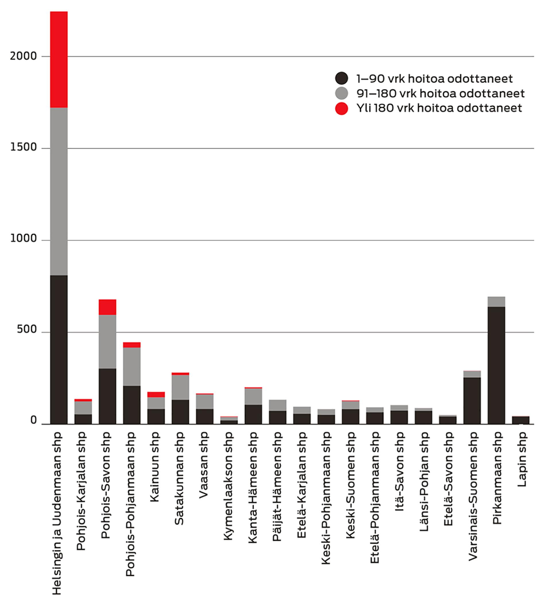 Elokuussa jonottaneista 47 prosenttia oli odottanut leikkausta yli kolme kuukautta ja 12 prosenttia yli puoli vuotta. Selvästi eniten yli puoli vuotta jonottaneita oli HUSissa: 23 prosenttia kaikista hoitoa odottaneista, yhteensä 524 ihmistä. Toiseksi eniten oli Kainuun sairaanhoitopiirissä. Se tarkoitti 17:ää prosenttia ja 30:tä ihmistä.