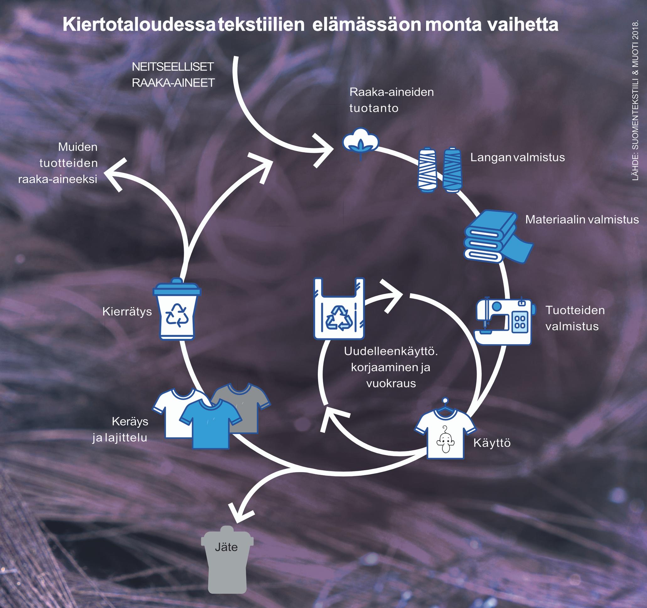 Suomessa tuotetaan vuosittain 70–100 miljoonaa kiloa tekstiilijätettä. Se on huolestuttava määrä eikä vähiten siksi, että tekstiilijätteen jalostaminen uusiksi tuotteiksi on hankalaa ja kierrätysprosessit usein pitkiä.
