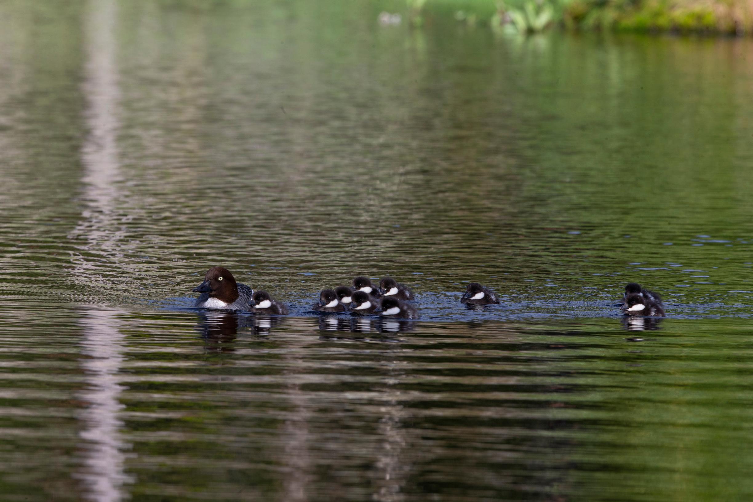 Tämän poikueen pienestä kotilammesta puuttuu yksi uhka: hauki. Iso hauki voi napata helposti telkänpoikasen, ja vesistöissä, joissa haukikanta on vahva, moni telkänalku päätyy petokalan suuhun.