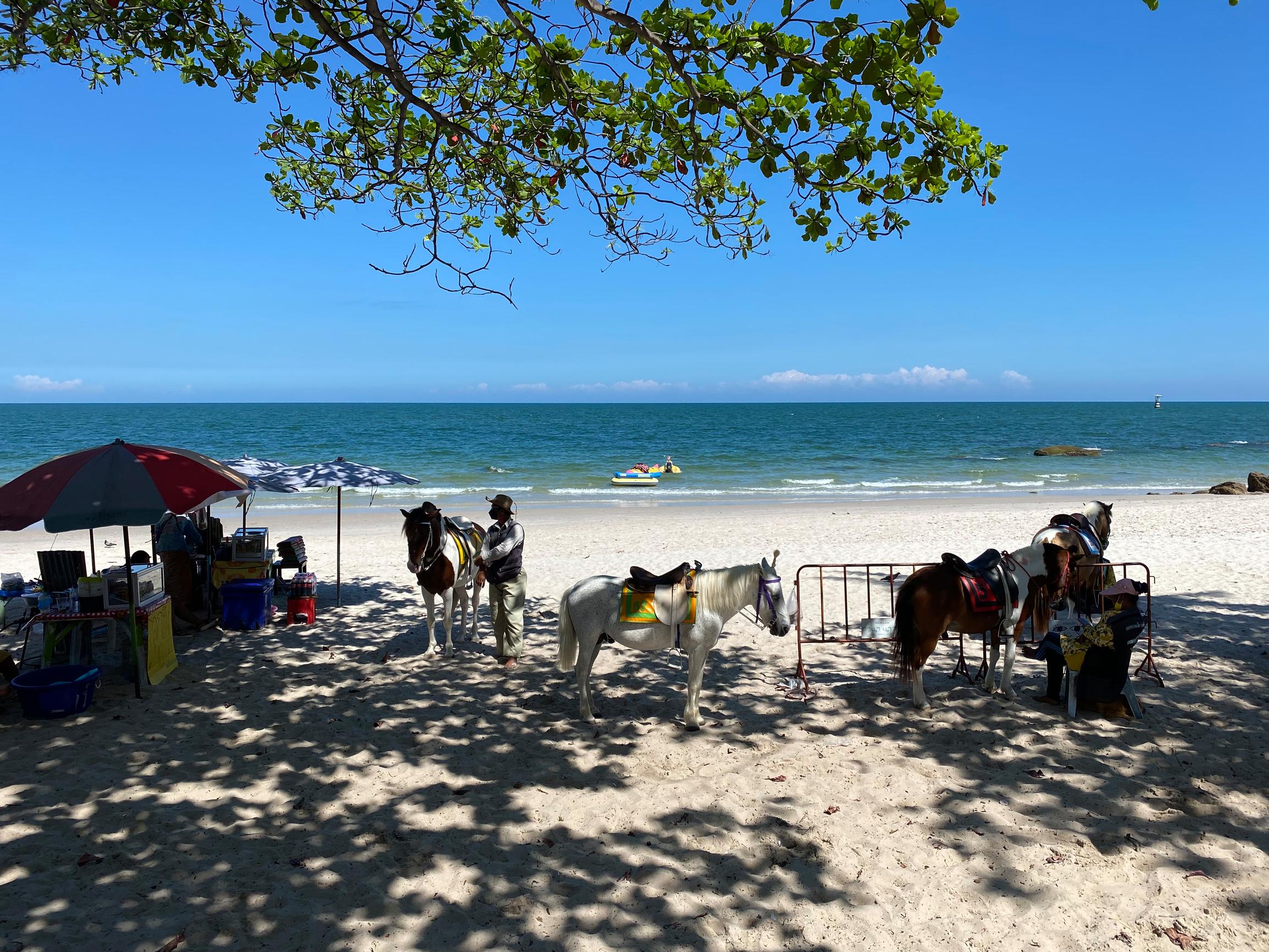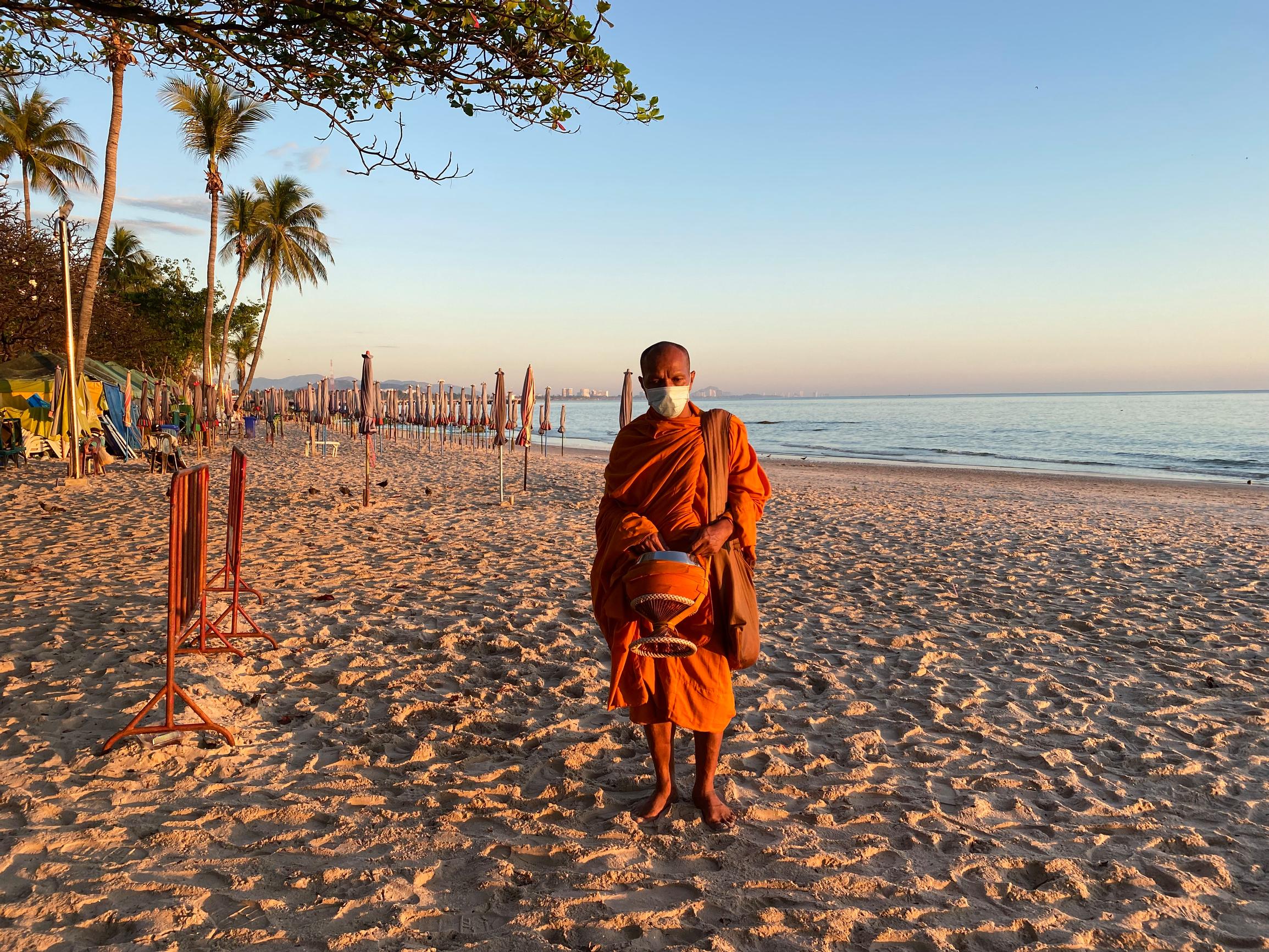 Hua Hinin turisteista autiolla hiekkarannalla, kaupungin vanhimman hotellin kulmilla 30 vuotta banaaneja kujalla friteerannut 60-vuotias rouva Wanna kertoo ansainneensa ennen pandemiaa noin tuhat bahtia päivässä, nyt hädin tuskin 200 bahtia, eli runsaat kuusi euroa.