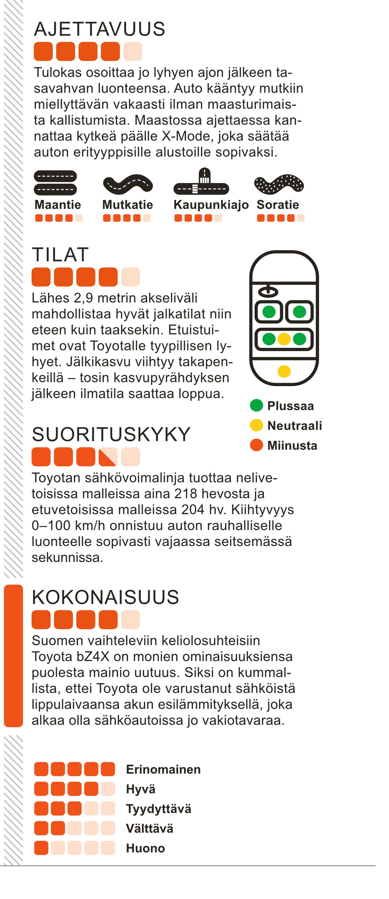 Ääntämisvaikeuksia tuottavan bZ4X:n hinnat liikkuvat samassa haarukassa Skoda Enyaqin ja Kia EV6:n kanssa. Vajaasta 50 000 eurosta lähtevä bZ4X on ensivaikutelmaltaan kilpailijoidensa veroinen vaihtoehto. Hyvien maasto-ominaisuuksiensa ansiosta se on myös tarpeeksi erilainen.