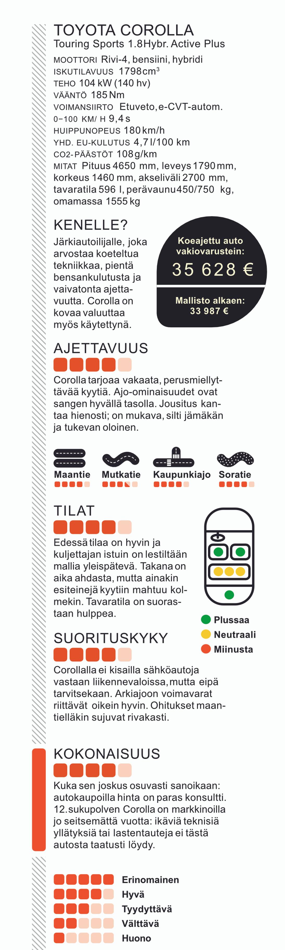 Hinta ei kuitenkaan ole farmari-Corolla ainoa salaisuus. Autossa on sellaista mutkattoman ja reilun perusauton tuntua, jota voisi kuvailla sanalla ajaton. Ulosponnahtavien ovenkahvojen, tunnottomien hipaisunäppäinten ja muiden ”edistyksellisten” trendien sijaan Toyotalla luotetaan yhä perinteisiin kierto – ja painokytkimiin ja vanhan liiton ohjaamoergonomiaan. Toki autosta löytyy kunnollinen tietoviihdenäyttökin. Nämä ovat tärkeitä käyttöominaisuuksia, joita auton-ostajat yhä arvostavat.