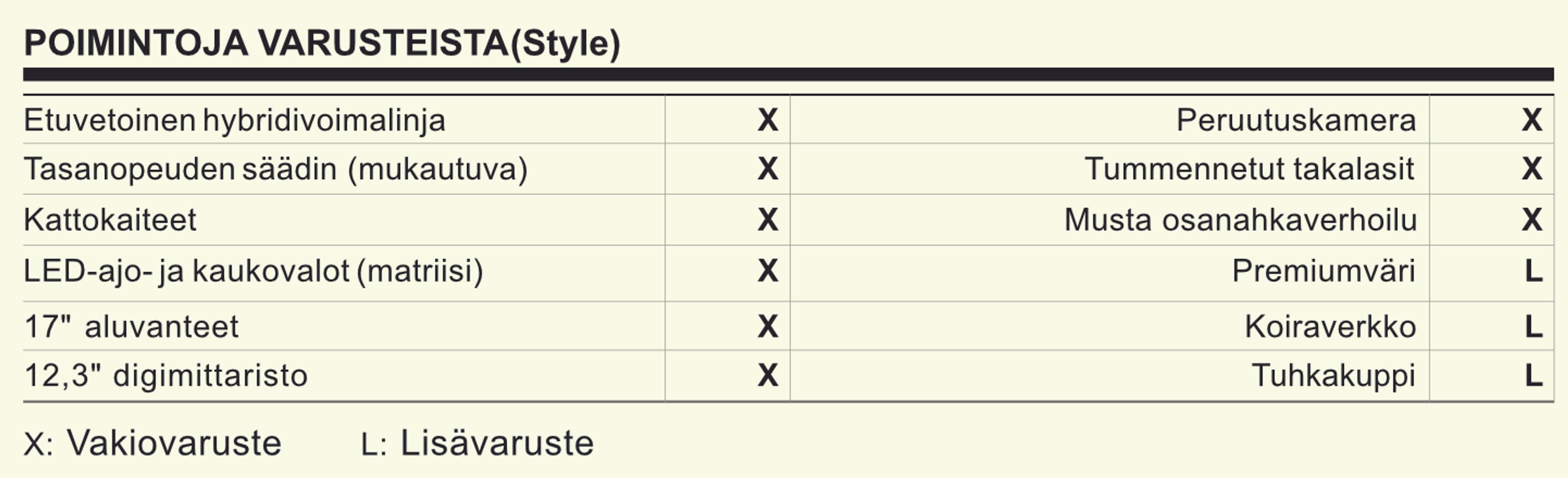 Varustetasoja on kaikkiaan peräti kuusi: Life, Active, Launch Edition, Style, GR Sport ja Premium. Koeajoomme näistä valikoitui keskitason paikkeille asemoituva Style.