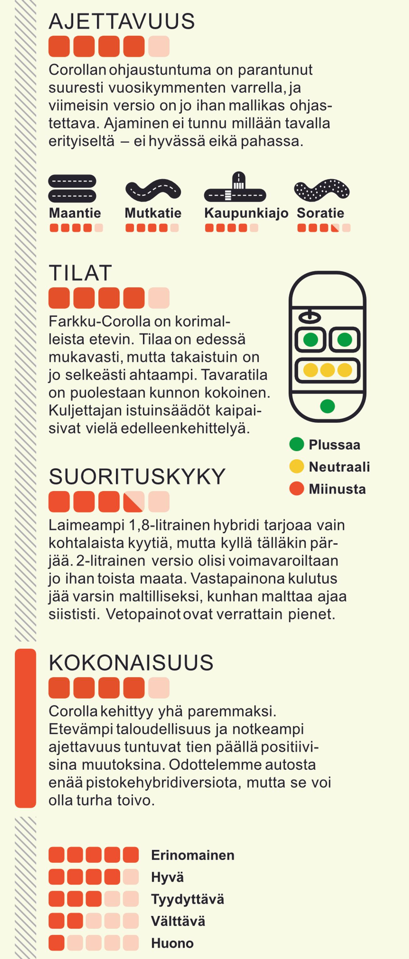 Ajettavuudeltaan Corolla on nykyisellään asiallinen suoriutuja. Ajotuntumassa ei ole erityistä huomautettavaa, ja auton hallittavuus on helppoa. Ajotiloja on kolme: Eco, Normal ja Sport. Käytimme näistä koeajolla ensisijaisesti Eco-ajotilaa, sillä laimeamman hybridi-Corollan idea on ennen kaikkea taloudellisuus. Sport-ajotilan käyttö on hieman itsensä huijaamista, sillä ei auto silläkään urheilulliseksi muutu. Eco- ja Normal-tilojen välillä ei toisaalta ole niin suurta eroa, etteikö ekoilua voisi valita ihan oletusasetukseksi.