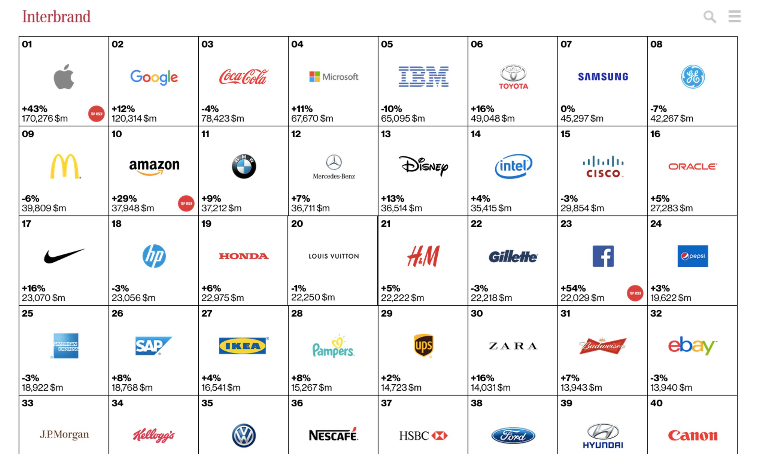 Brändien arvoa mittaava Interbrand on julkaissut taas rankingin maailman arvokkaimmista brändeistä.