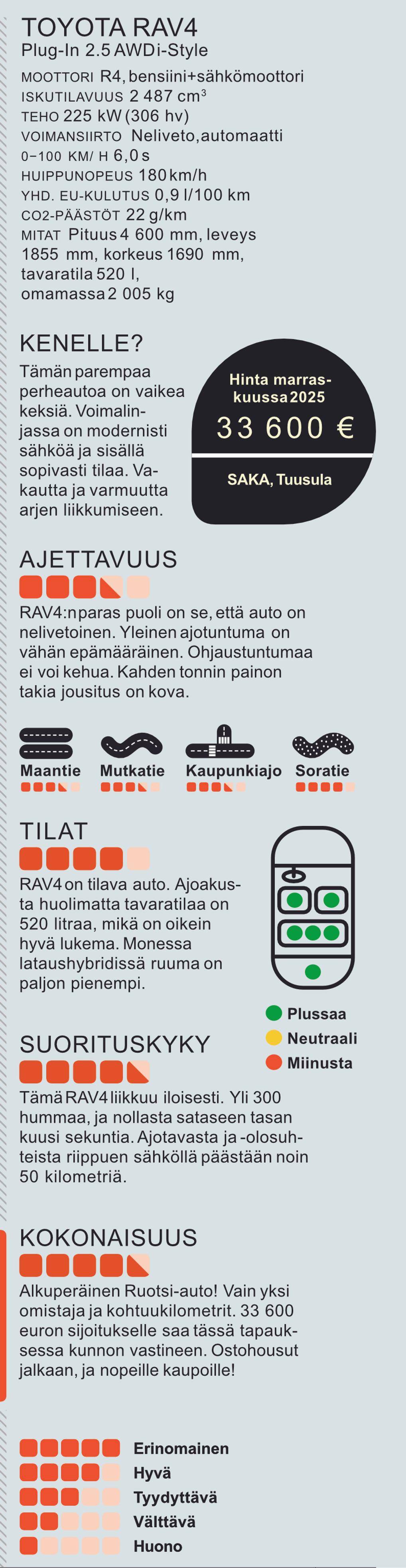 Ruotsista uitettu, vain yhden omistajan Toyota RAV4 PHEV vm. 2021 näyttää paperilla unelmalta: 306 hevosvoimaa, neliveto, 520 litran tavaratila ja 1 500 kg vetomassa. Koeajossa paljastuu, että vaikka RAV4 tekee kaiken “oikein”, ajotuntuma ja kova jousitus eivät sytytä. Kun hintalapussa lukee 33 600 euroa, kysymykseen ostohousujen pukemisesta on vain yksi oikea vastaus.