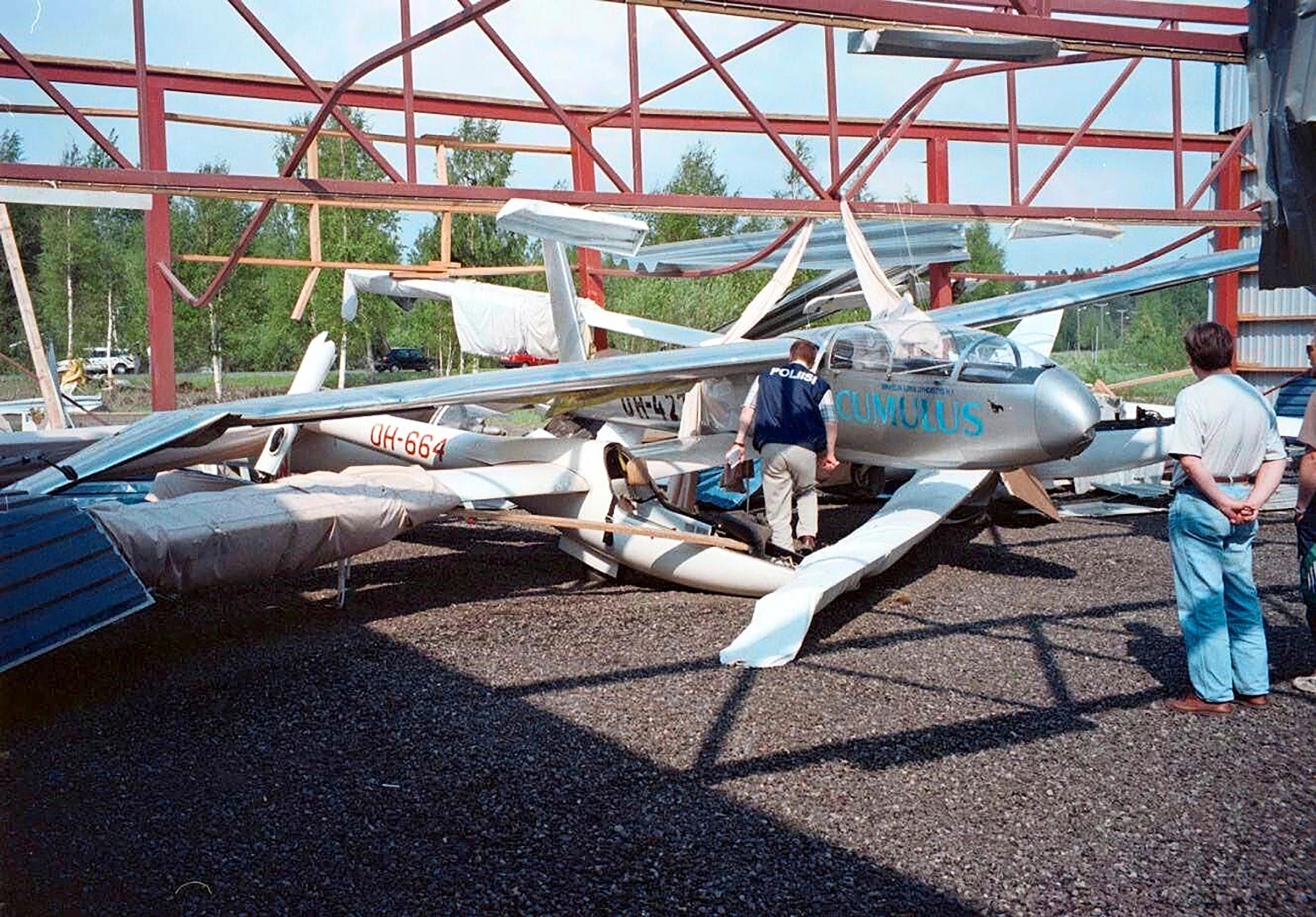 Vahvat hallin teräspalkitkin vääntyivät. Samalla hajosi myös koko ilmailuyhdistyksen viiden koneen purjelentokalusto.