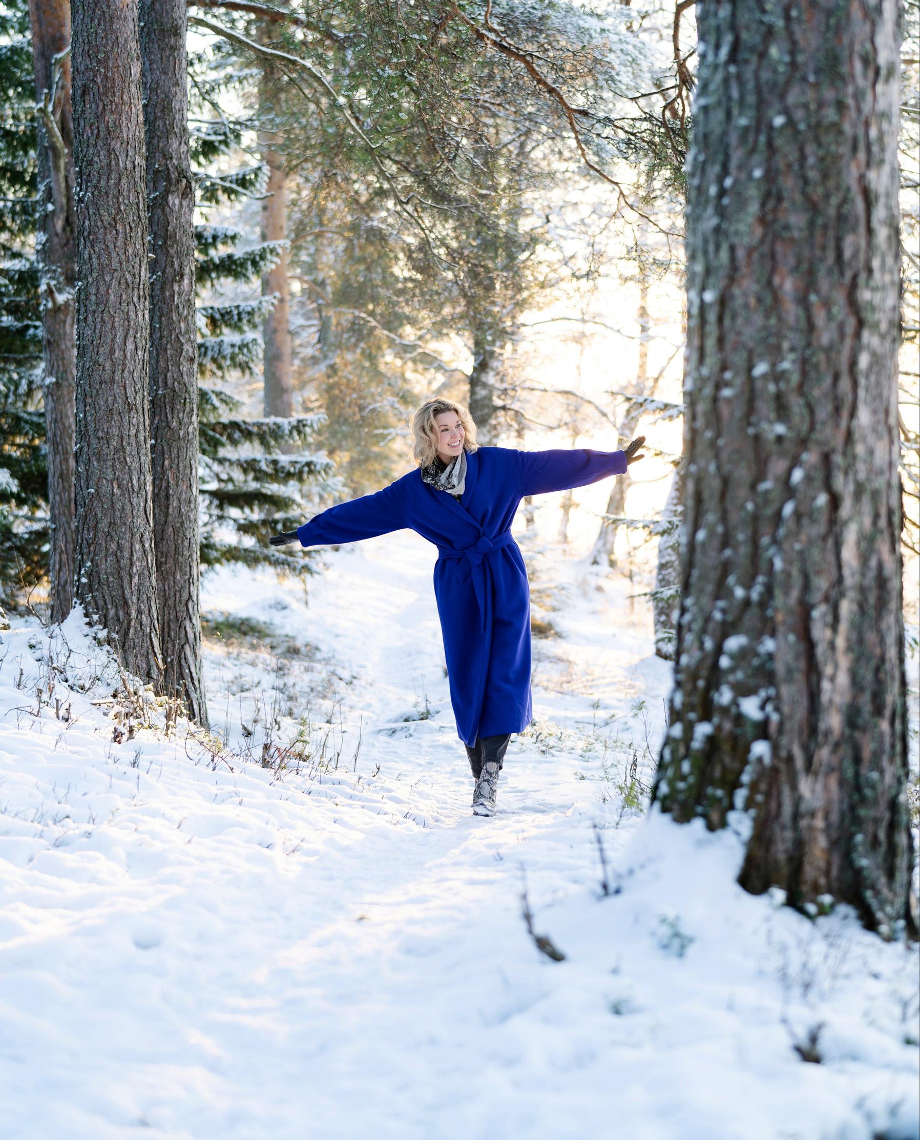 Pakkanen on noussut yön aikana kymmeneen asteeseen. Pipoa hän ei silti halua laittaa päähänsä. Se litistäisi kampauksen. Hän keimailee kameralle tottuneesti, hymyilee ja elehtii. Näyttää muodikkaalta citynaiselta.