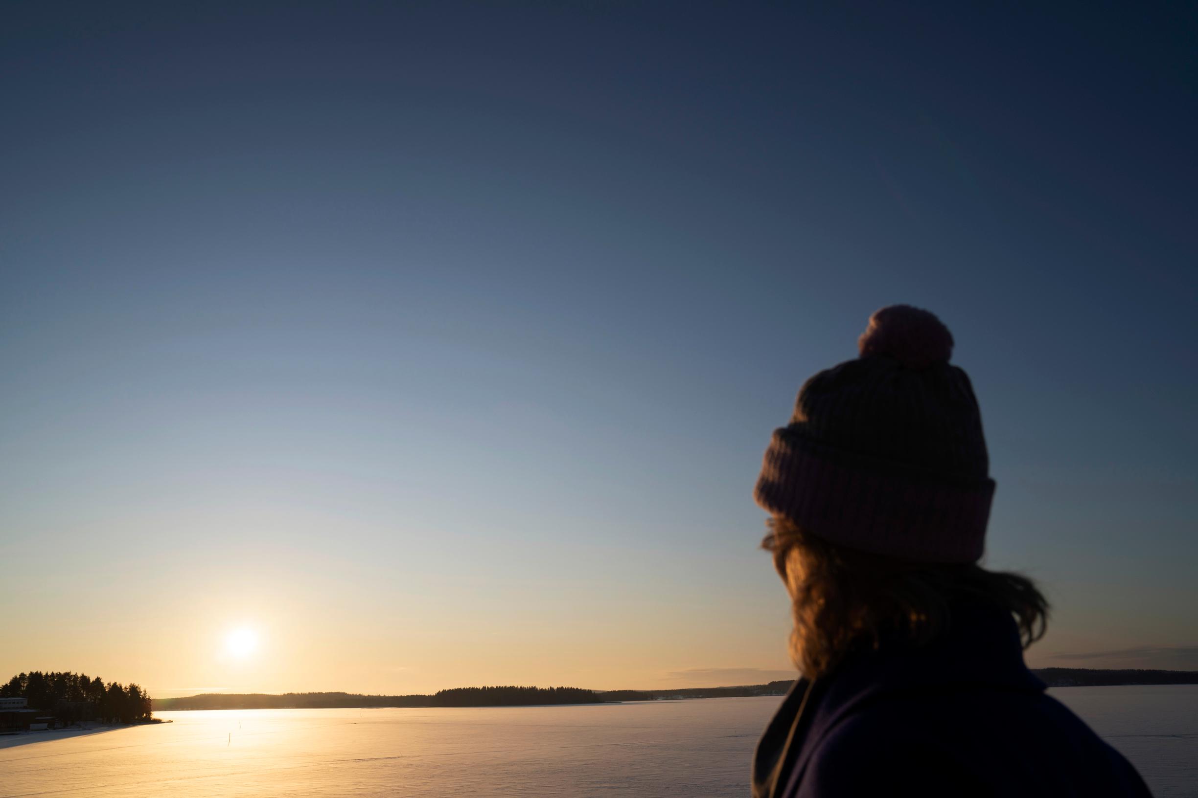 Aamu kirkastuu. Parvekkeen ikkunasta avautuu näkymä jäiselle Porovedelle. Lahdenpoukaman takana erottuu pallomainen tumma möhkäle.