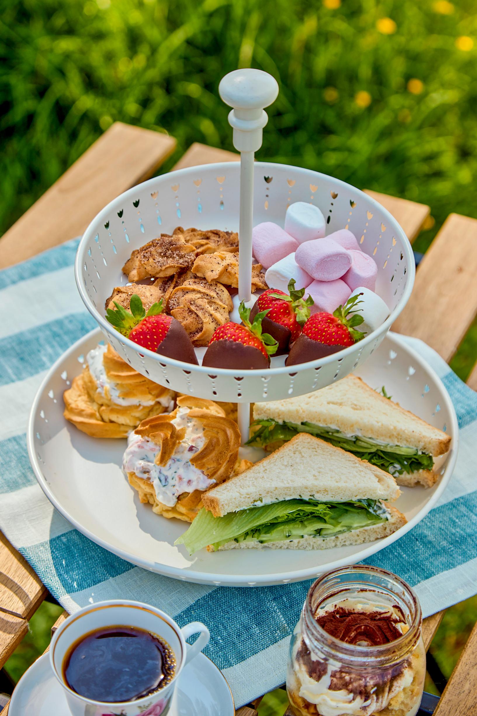 Kahvilanpitäjä ojentaa pakkaamansa eväskorin ja opastaa kävijän puutarhaan. Siellä piknikvierasta odottaa aurinkovarjon alla oma pöytäryhmä, jonka ympärillä levittäytyy kasvimaa.