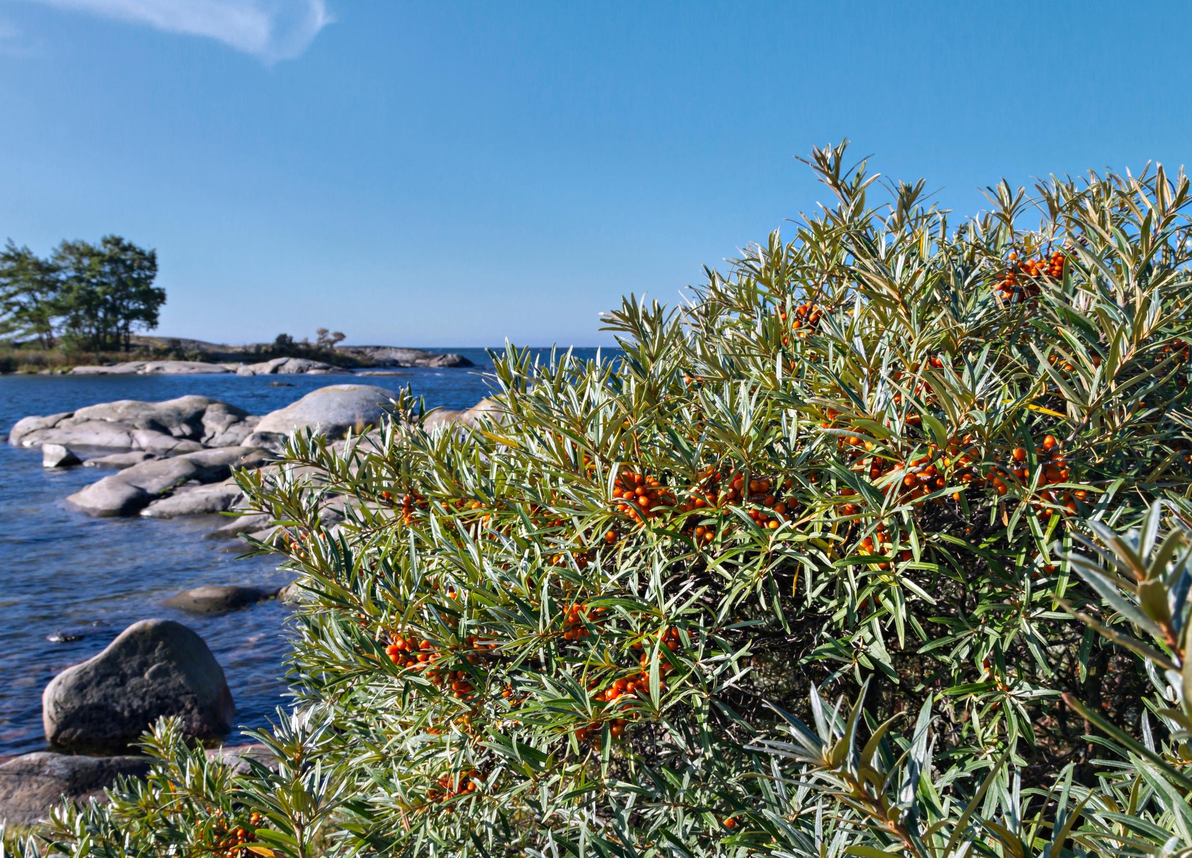 Saaren rantakivikossa kasvaa tiheä vyöhyke hopeanharmaalehtisiä, parimetrisiä pensaita. Niiden oksat notkuvat oranssien marjojen painosta, joita yhdessä pensaassa on todella runsaasti. Tyrni on rantojen piikikäs aarre, jonka marjat ovat todellisia vitamiinipommeja.