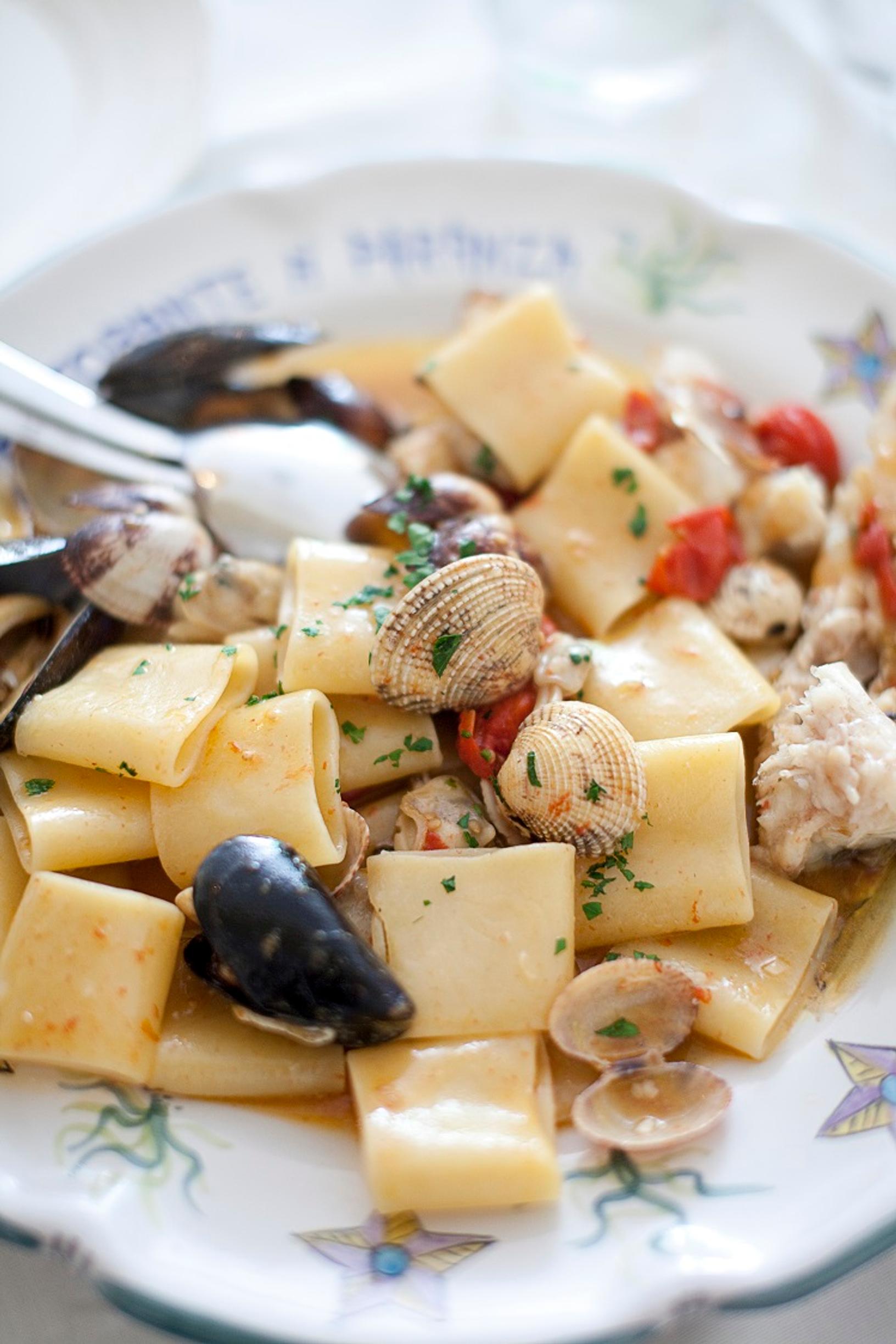 Toisessa ravintolassa tuodaan pöytään pata, ja kannen alla höyryää hyvältä tuoksuva zuppetta di frutti di mare. Keiton ainesosat ovat yksinkertaiset: erilaisia simpukoita ja kirsikkatomaatteja valkosipulia huokuvassa liemessä.