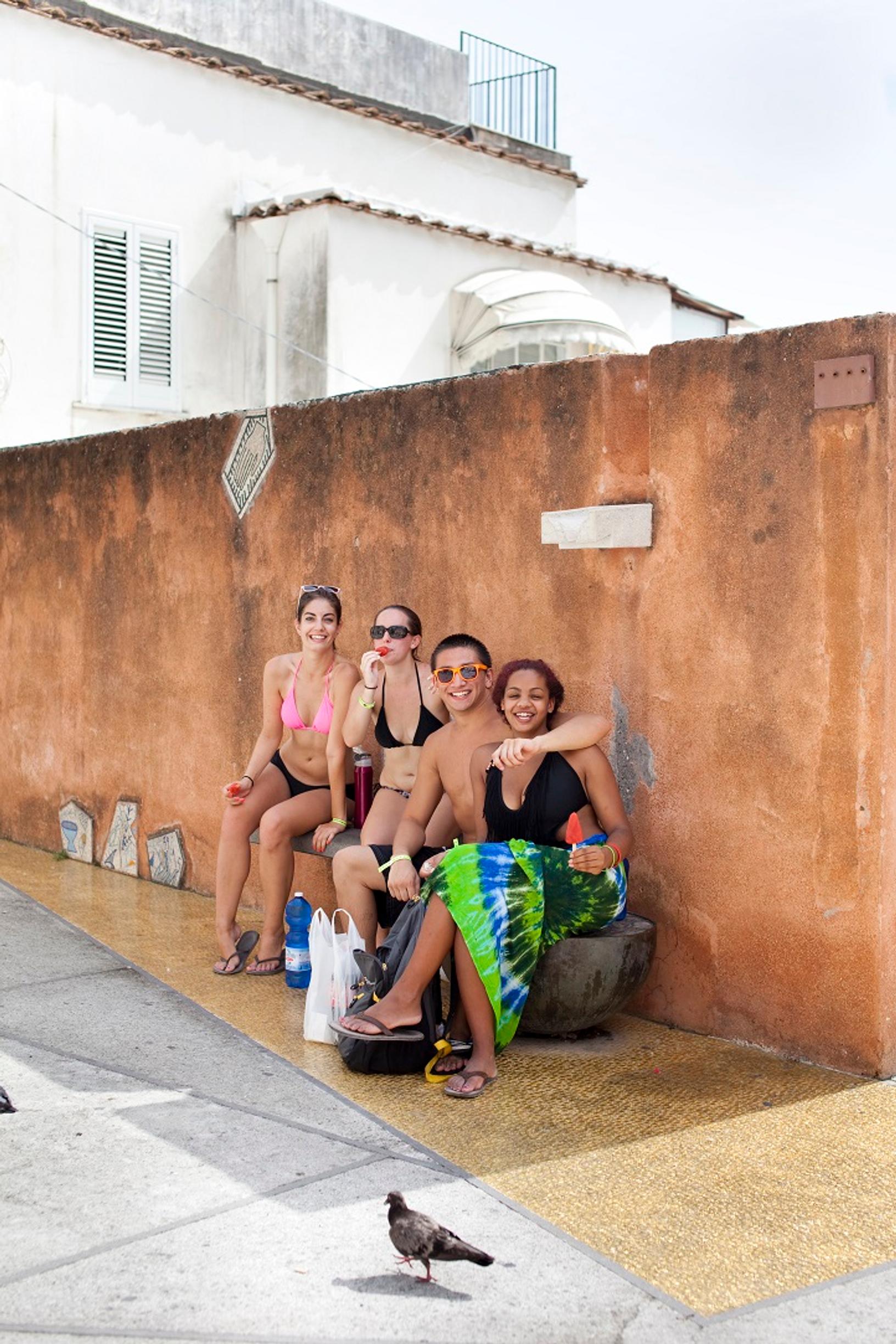 Piazza Umberto -aukiolla on muutama kahvila ja pyhäpäivää viettäviä kyläläisiä. Juhlavaatteisiin sonnustettu pikkutyttö kikattaa isänsä sylissä, ystävättäret vaihtavat poskisuudelmat. Kolme nuorta miestä nojailee vanhaan suihkulähteeseen.