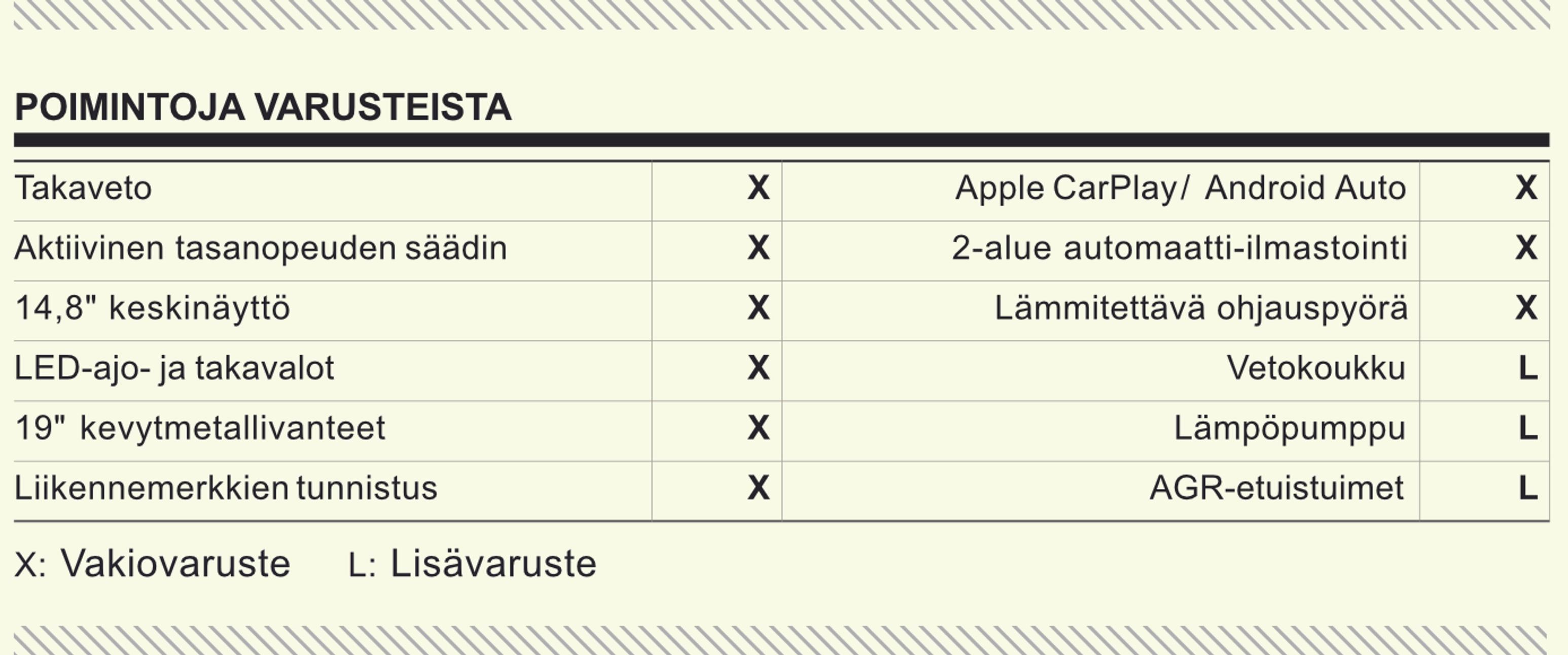 Varustetasoja on vain kaksi. Perusauton lisäksi valittavissa on Capri Premium, jonka myötä autoon tulevat muun muassa 20-tuumaiset pyörät, parempi audiojärjestelmä, matriisiajovalot ja ohjaamon tunnelmavalaistus. Lisähinta tästä on aina maltillinen tasan 2000 euroa. Molemmista varustetasoista voi valita joko pienempi- (170 hv) tai isompiakkuisen (286 hv) Extended Range -takavetoversion sekä nelivedon, jossa on aina 79 kWh:n akusto sekä 340 pollen potkut.