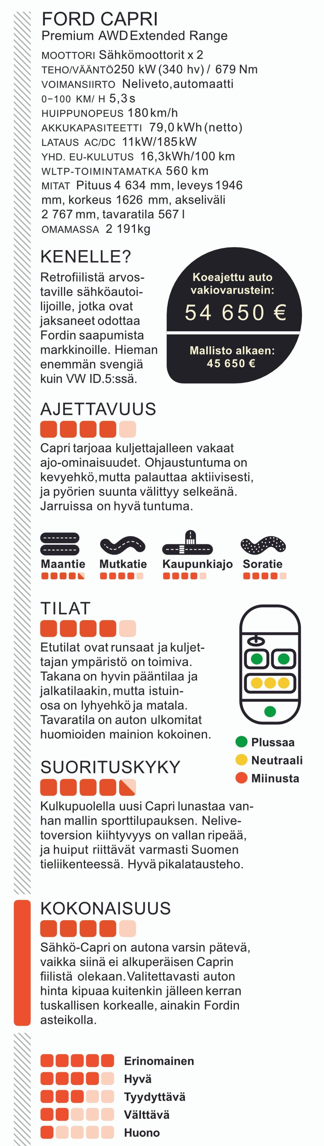 Esimerkiksi Caprin tuulilasi on taaempana ja alusta parisen senttiä matalammalla kuin Volkswagenissa. Pinnan alta Capri on kuitenkin Volkswagen ID.5 luita ja ytimiään myöden. Auton saa taka- tai nelivetoisena; akkukoot ovat 52, 77 ja 79 kWh. Sisälle istuessa VW-maailma lävähtää esiin viimeistään pystysuuntaisen käyttöliittymäohjelmiston ja ohjauspyörän viiksien myötä.