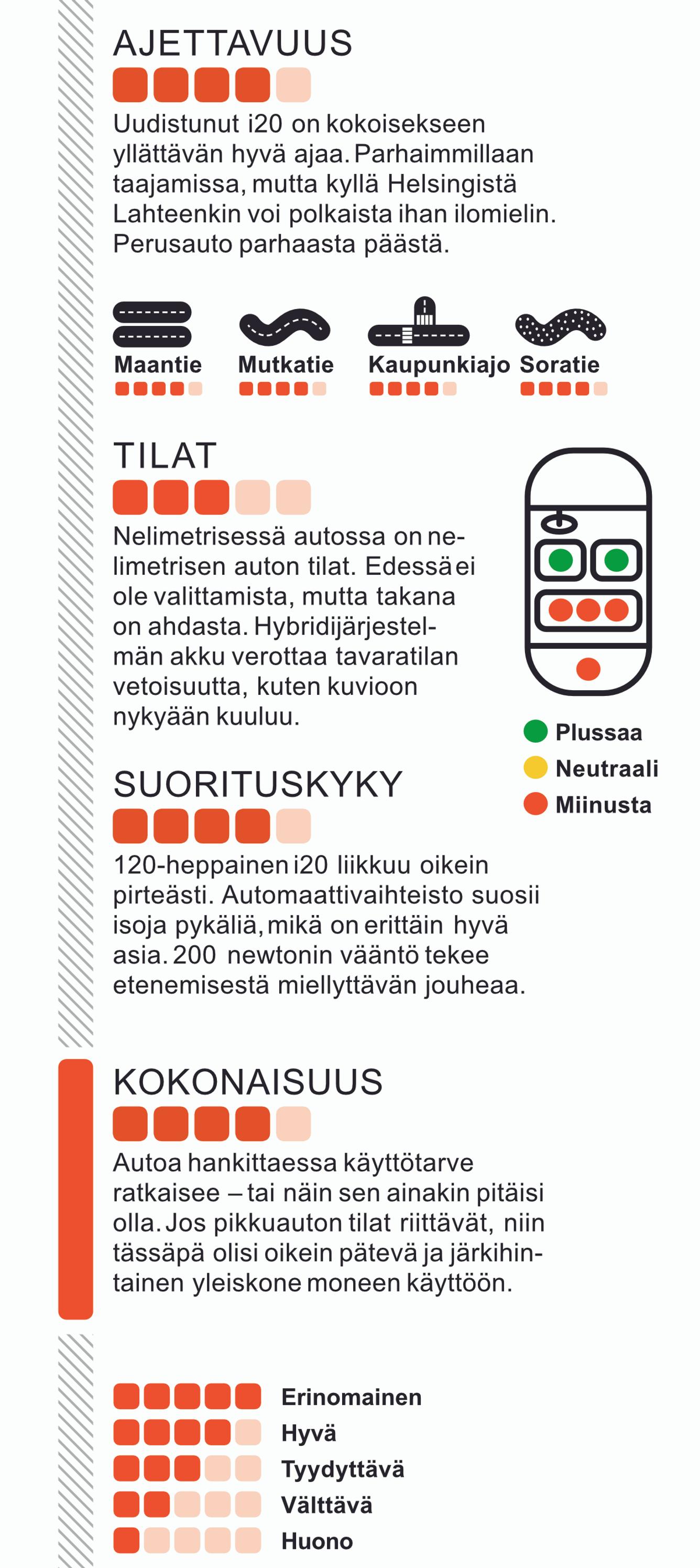 Uudistunut Hyundai i20 on hyvä esimerkki korealaisten voimakkaasta panostuksesta tuotekehitykseen. Tuoreen mallin tunnistaa entistä röyhkeämmän näköisestä keulasta. Matkustamossa huomio kiinnittyy entistä laajempiin liitettävyysmahdollisuuksiin. Keskinäyttö on nyt vakiona 4,2-tuumainen. Ajamassamme yksilössä oli lisävarusteena niin sanottu Safety Pack. Siihen kuuluvat mm. mukautuva vakionopeussäädin ja hätäjarrutusjärjestelmä, joka tunnistaa autot, jalankulkijat, fillaristit ja risteysalueet. Koeajon perusteella voi sanoa, että järjestelmä toimii hyvin. Se ei häiritse kuljettajaa jatkuvalla paineella ja piippauksella, vaan varoittelee kuskia tarpeen tullen juuri sopivasti.