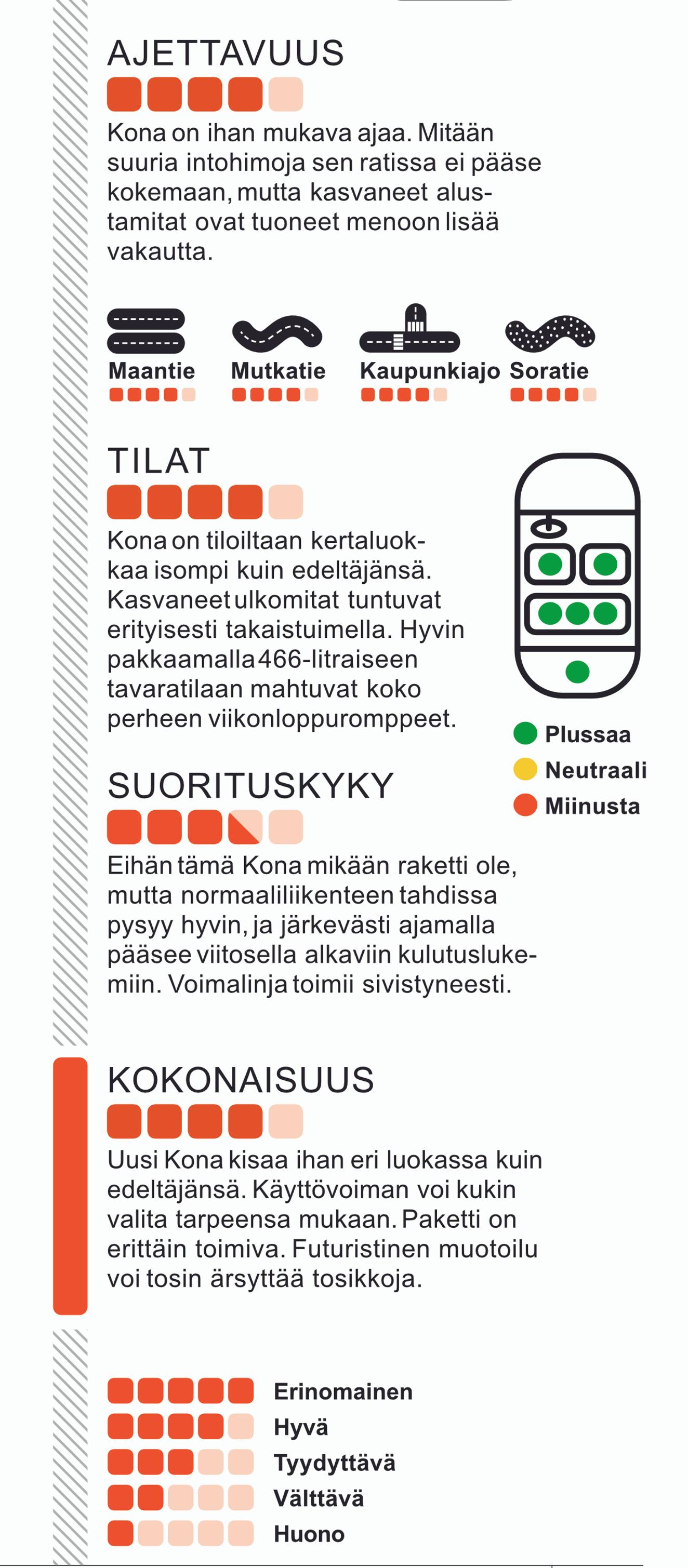 Kona on mukava ajaa. Kasvaneet alustamitat ovat tuoneet menoon lisää vakautta. Nyt ei puhuta enää mistään pikkuautosta.