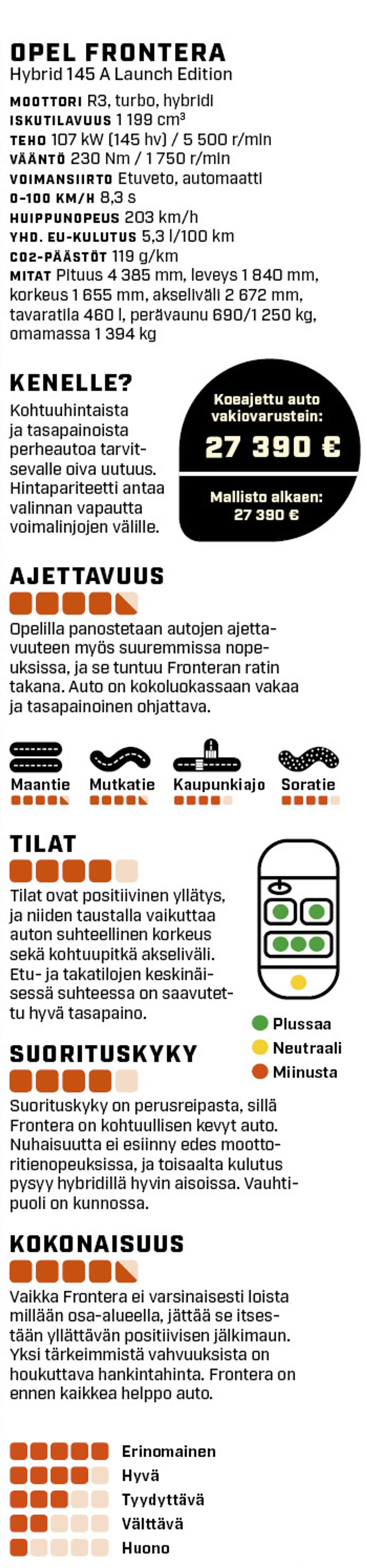 Frontera on mutkaton perusauto, joka ei pyri pröystäilemään millään saralla. Silti se pystyy tarjoamaan perheautoksi soveltuvat hyvät tilat, perustasoisen suorituskyvyn ja taloudellisuuden sekä jämäkkää ajettavuutta. Auto on lopulta kokoaan suurempi kokonaisuus, joka yllättää arkikäytössä positiivisesti. Tästä on hyvä jatkaa, ja Opelin soisi jatkossakin löytävän paikkansa Stellantiksen portfoliossa.