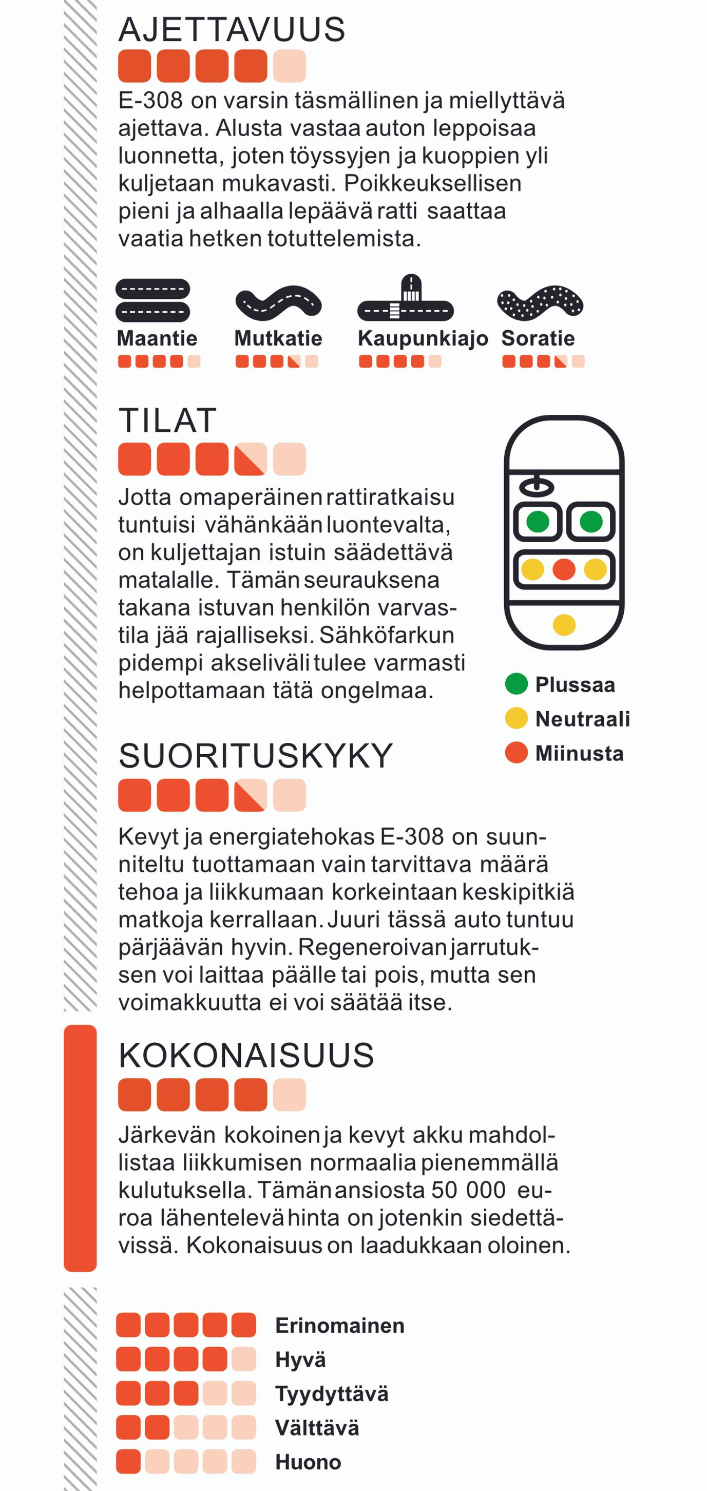 Kevyt ja energiatehokas E-308 on suunniteltu tuottamaan vain tarvittava määrä tehoa ja liikkumaan korkeintaan keskipitkiä matkoja kerrallaan. Juuri tässä auto tuntuu pärjäävän hyvin.