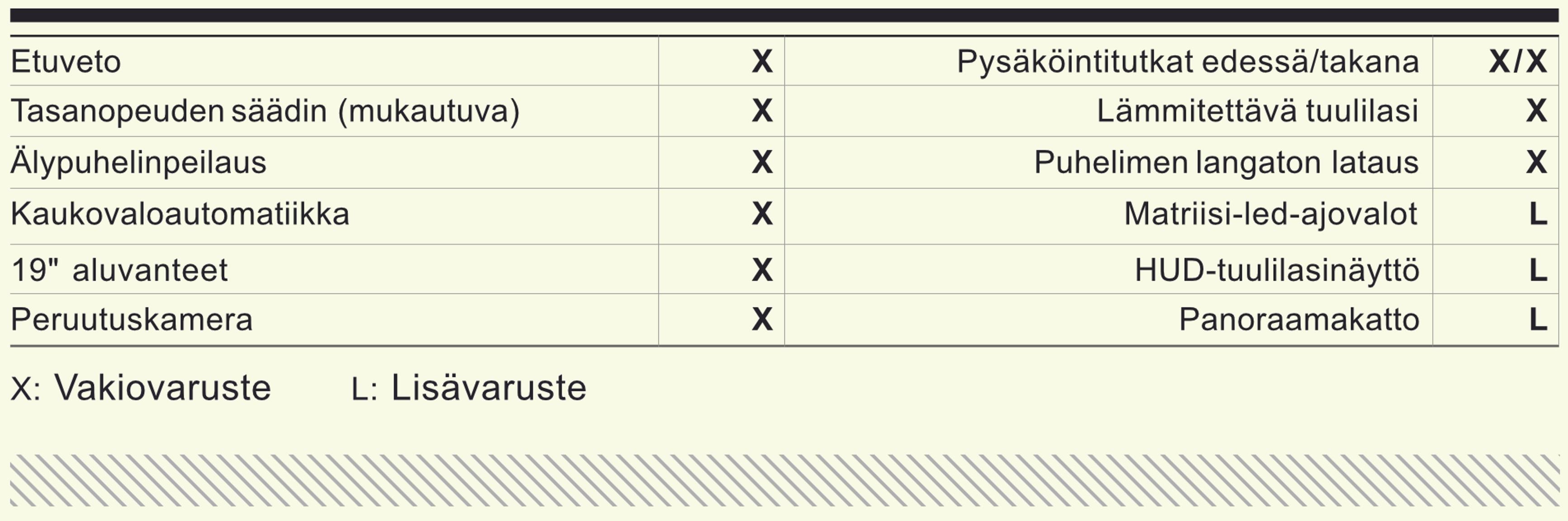 Auton varustelu on sen luonteen mukaisesti varsin kattavaa. Kaikissa versioissa on Technosta alkaen vakiona muun muassa 12,3-tuumaisen muunneltavan digitaalimittariston ja kojelaudan keskelle sijoitetun pystysuuntaisen kosketusnäytön yhdistelmä, johon kuuluvat niin navigointi kuin peruutuskamerakin. Kuljettajan apuna on monipuolinen valikoima avustavia järjestelmiä ja pysäköinnissä auttavat etu-, taka- ja sivupysäköintitutkat. Mukavan ajoasennon löytymisessä auttavat istuimen sähkösäädöt, joiden lisäksi kuljettajan istuimessa on säädettävä ristiselän tuki ja hierontatoiminto. Tavaratilan käyttöä helpottaa handsfree-toiminnolla varustettu sähkötoiminen takaluukku.