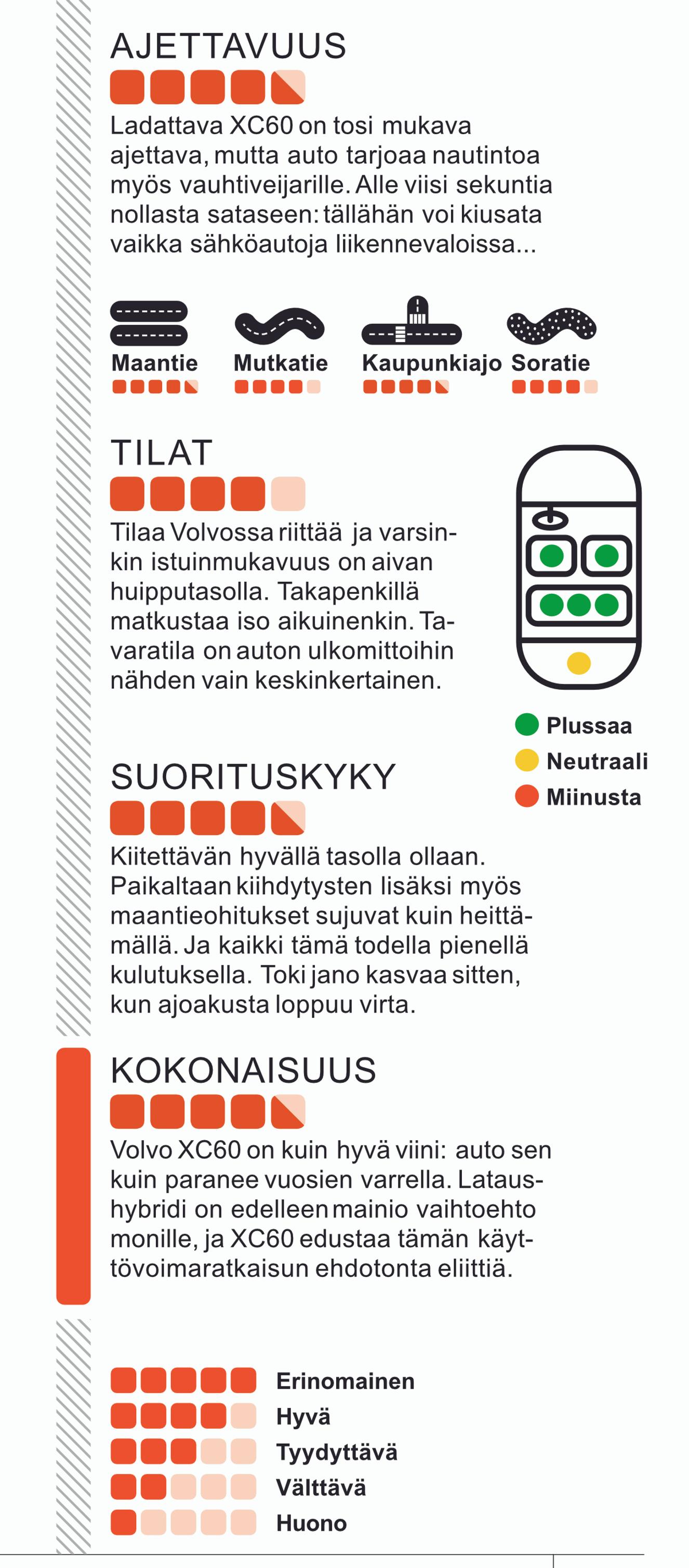 Volvo XC60:n on siis todellakin oltava hyvä auto, kun sen kerran suomalainen kansa on omakseen ottanut. Se on useiden vuosien ajan keikkunut lataushybridien myyntiykkösenä. Ja kun autolla ajaa, menestystä ei tarvitse ihmetellä. Tässä autossa tuntuu olevan hyvin paljon kaikkea sitä, mitä peruskäyttäjä tarvitsee.