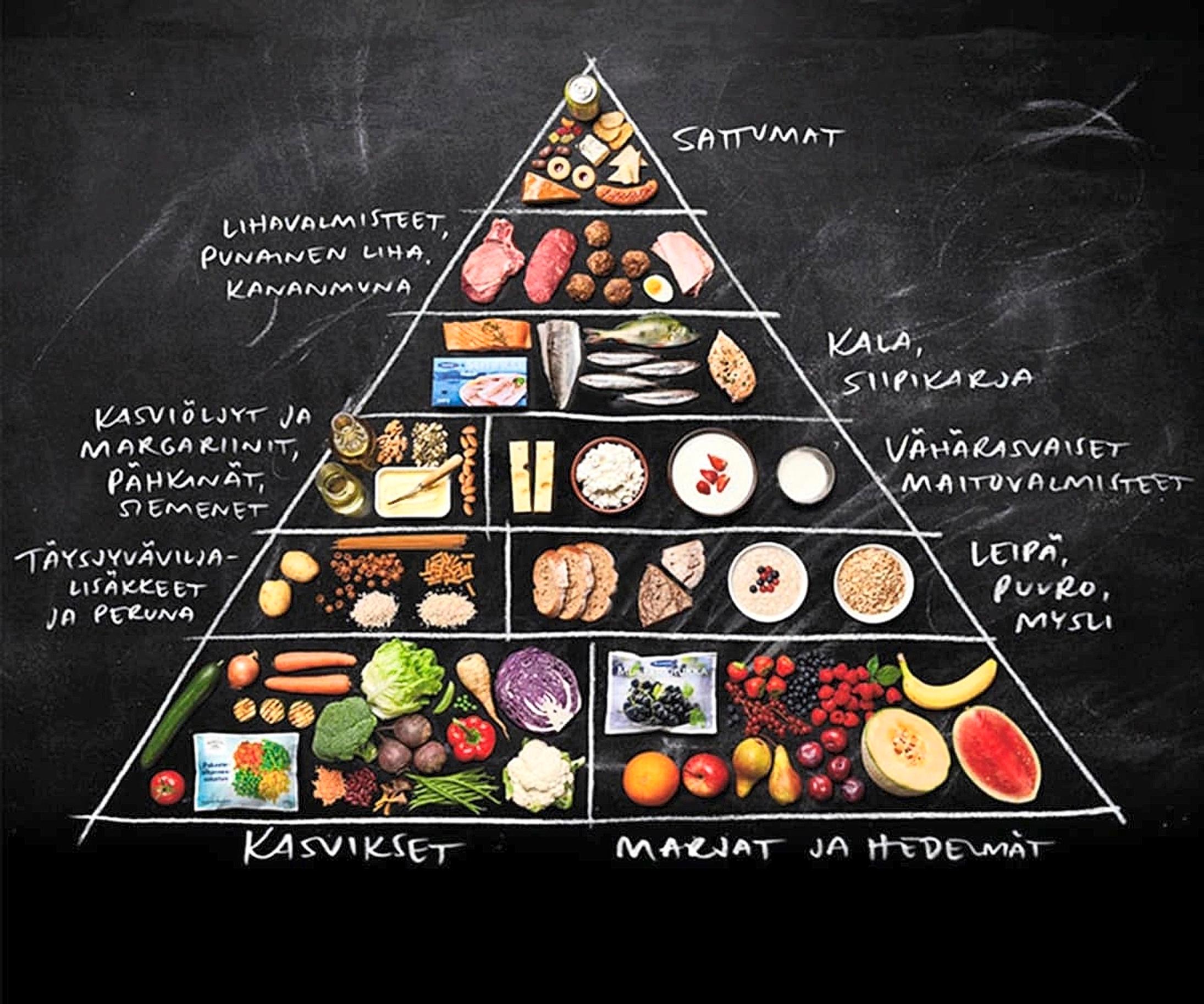 Suomalaisessa mallissa ruokaryhmiä oli lähes alusta lähtien seitsemän sijaan kuusi, sillä marjat, hedelmät ja vihannekset olivat samassa eivätkä kahdessa erillisessä lohkossa.