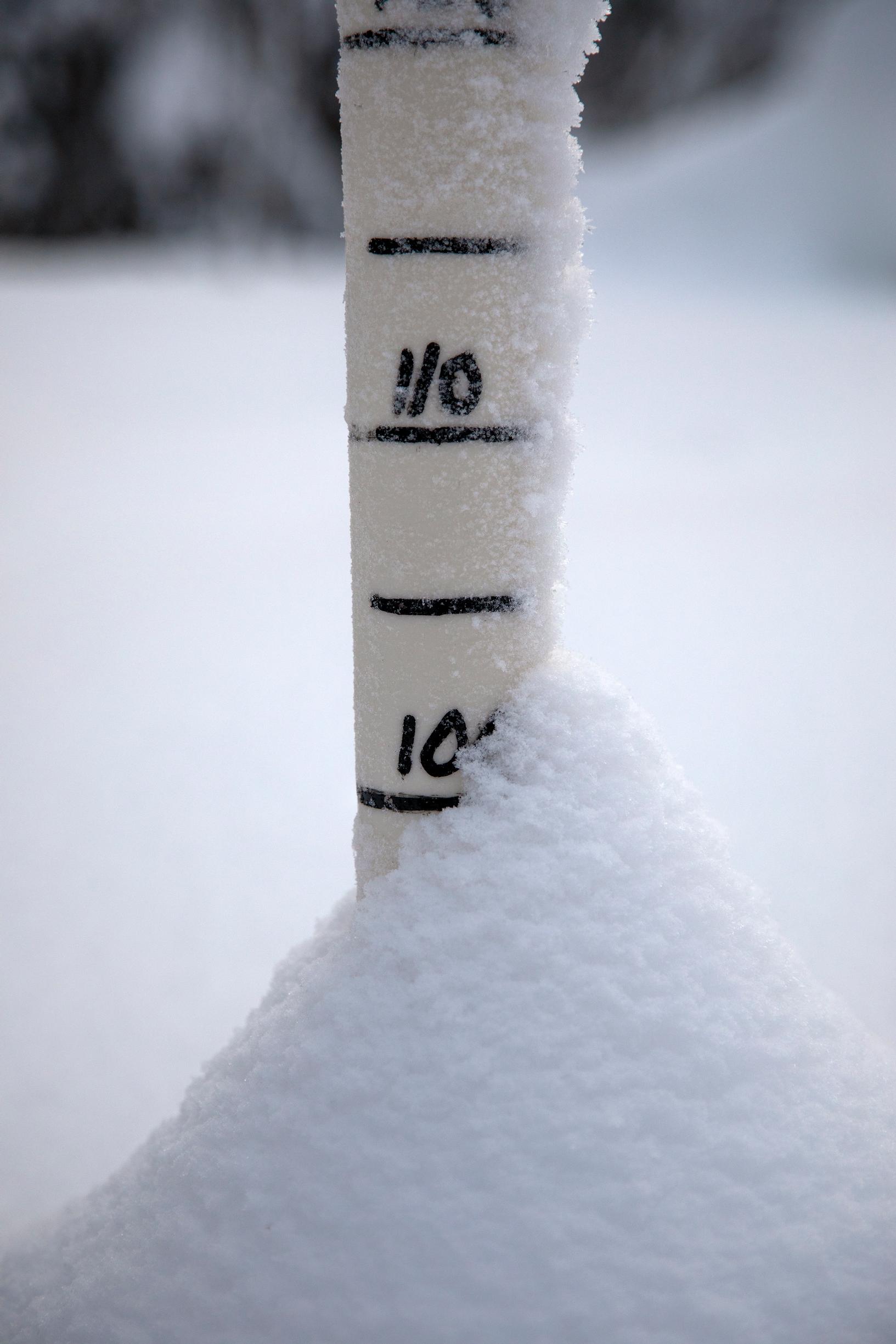 Hän pyyhkii rukkasellaan tuulen kuljettaman irtolumen mittauskepin juurelta. Tunturin rinteessä lumensyvyys on 95 senttimetriä.