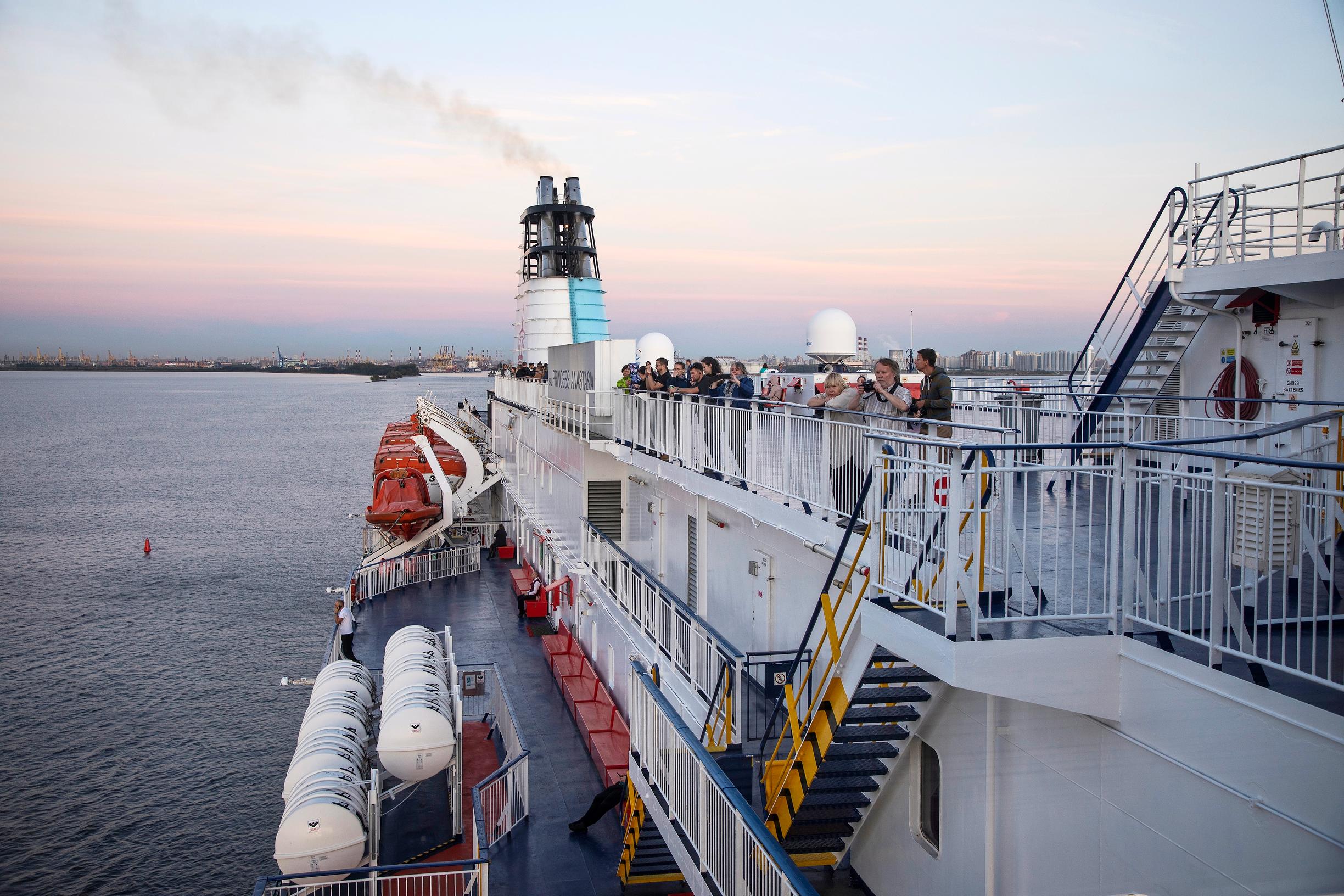 Raja on ylitetty yön aikana huomaamatta, ja Anastasian kannelta aukeaa komea näkymä auringonnousun eri sävyissä. Kronstadtin saaren siluetti muistuttaa, että vuonna 1703 Venäjän linnoitukseksi perustettu alue on nykyään lähes 50 000 asukkaan pienoiskaupunki Pietarin rajojen sisällä.