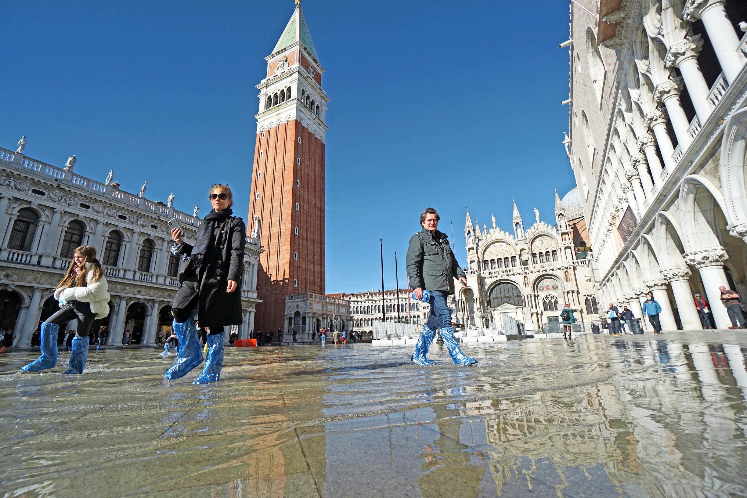 Artikkelin kuva on Venetsiassa Pyhän Markuksen aukiolta vuoden 2021 marraskuussa, jolloin turistien piti suojata jalkansa vedeltä kalosseilla.