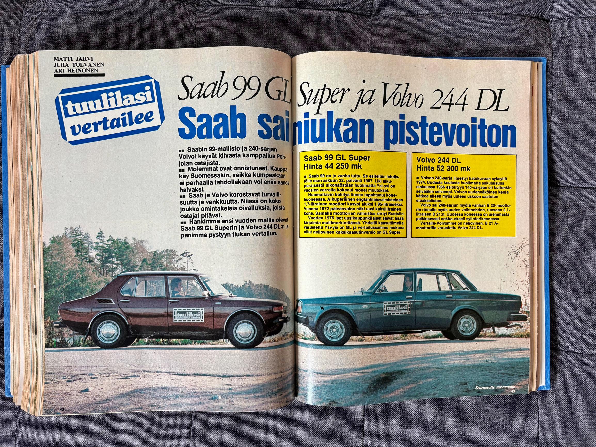 Saab 99 ja Volvon 240-mallisto eivät olleet 70-luvun puolivälissä lainkaan halvimman pään autoja; ne edustivat hintaluokkaa 40 000 – 50 000 markkaa. Silti ne pysyttelivät vuodesta toiseen Suomen myyntitilastoissa kymmenen parhaan listalla. Tuulilasi laittoi ruotsalaisautot parivertailuun syksyllä 1975.