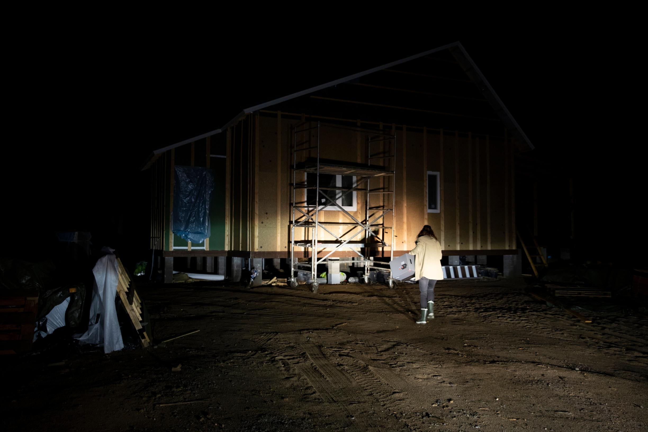 Kirsi Salo ja talotyömaalle tullut rakennusmies naureskelevat, mutta vitsailussa on vakavampikin sävy. Valvontakamera on asennettu ilkivallan varalta, mutta riuskalle rakentamiselle on huutava tarve. Salo ei itse ehdi rakennustyömaalle kokopäiväisesti eivätkä talkoolaiset osaa taloa yksin pykätä.