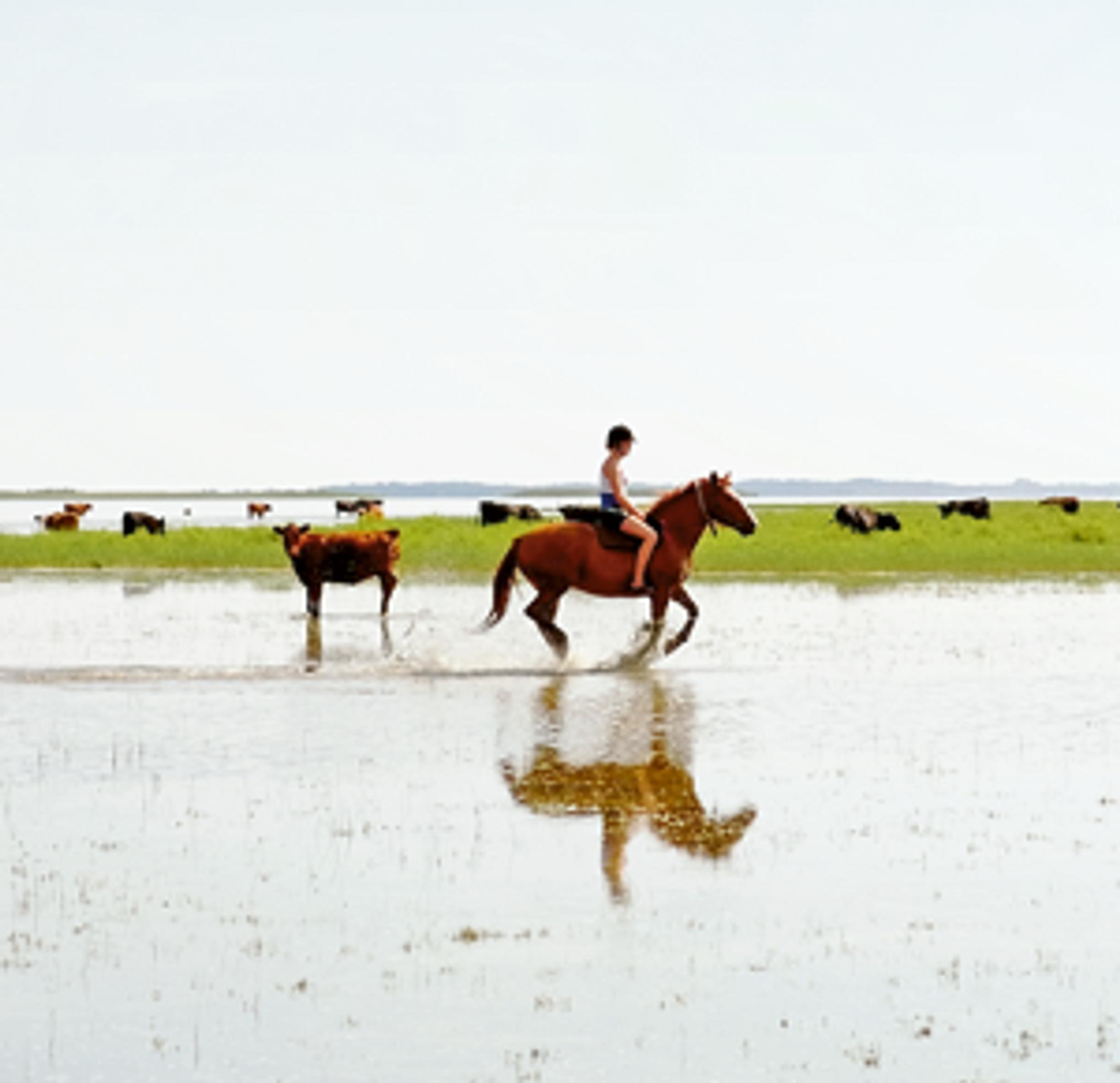 Matkalla hevoset pysähtyvät peltoaukealle syömään, ja seuraksi ilmaantuu joukko lehmiä. Ne vilvoittelevat pienen lammikon luona välittämättä siitä, että yksi hevosista kirmaa lammikon läpi loiskuttaen mutavettä ympäriinsä.