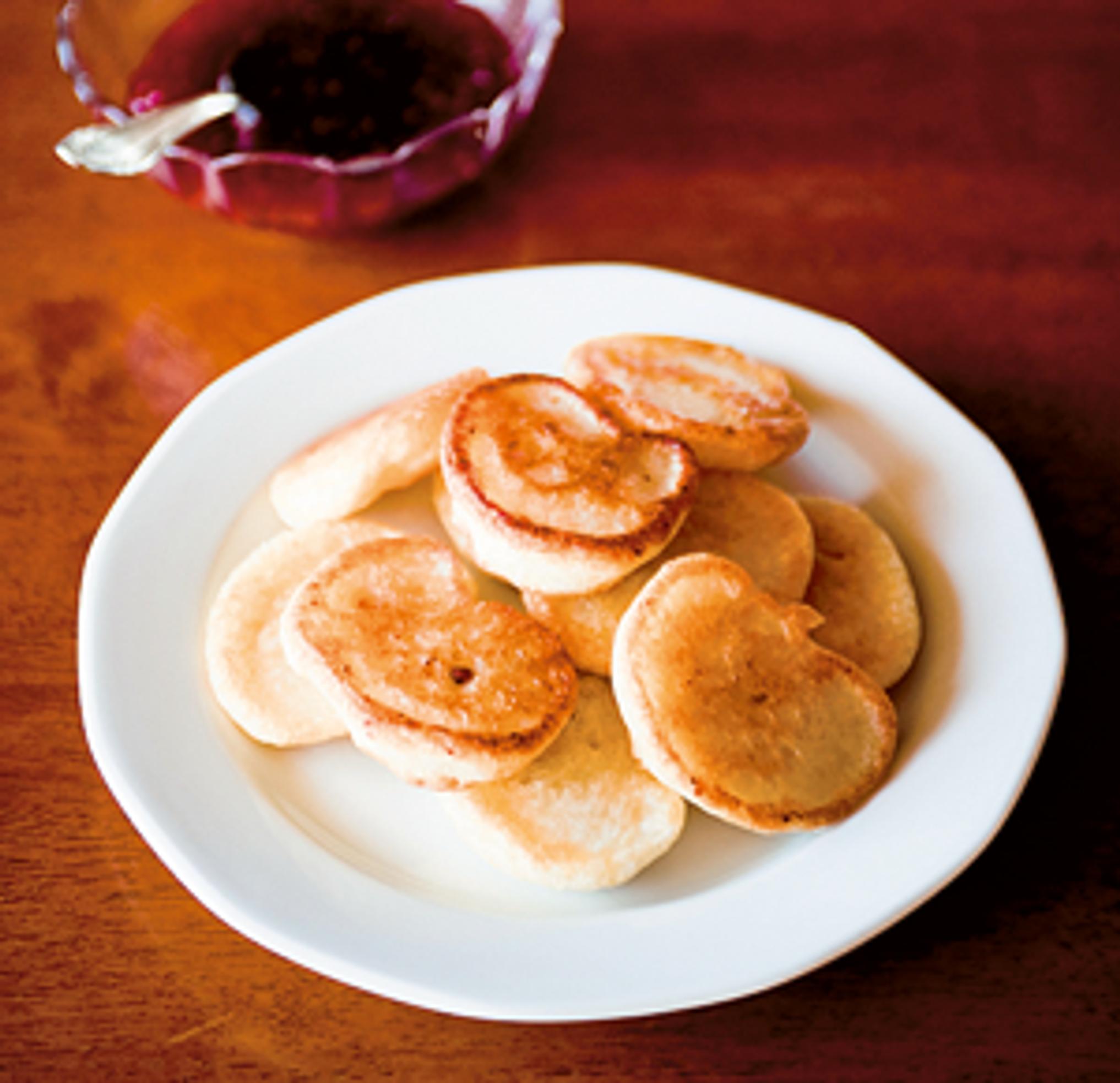 Hetken päästä eteen kannetaan lautasellinen kuumia pannukakkuja. Vaaleat, pienet ja rapeat pannukakut on aseteltu kauniisti lautaselle. Kymmenen pannukakun pino on juuri sopiva, ja kaverina maistuu parhaiten vadelmahillo ja lasillinen maitoa. Yksinkertaiset maut toimivat.