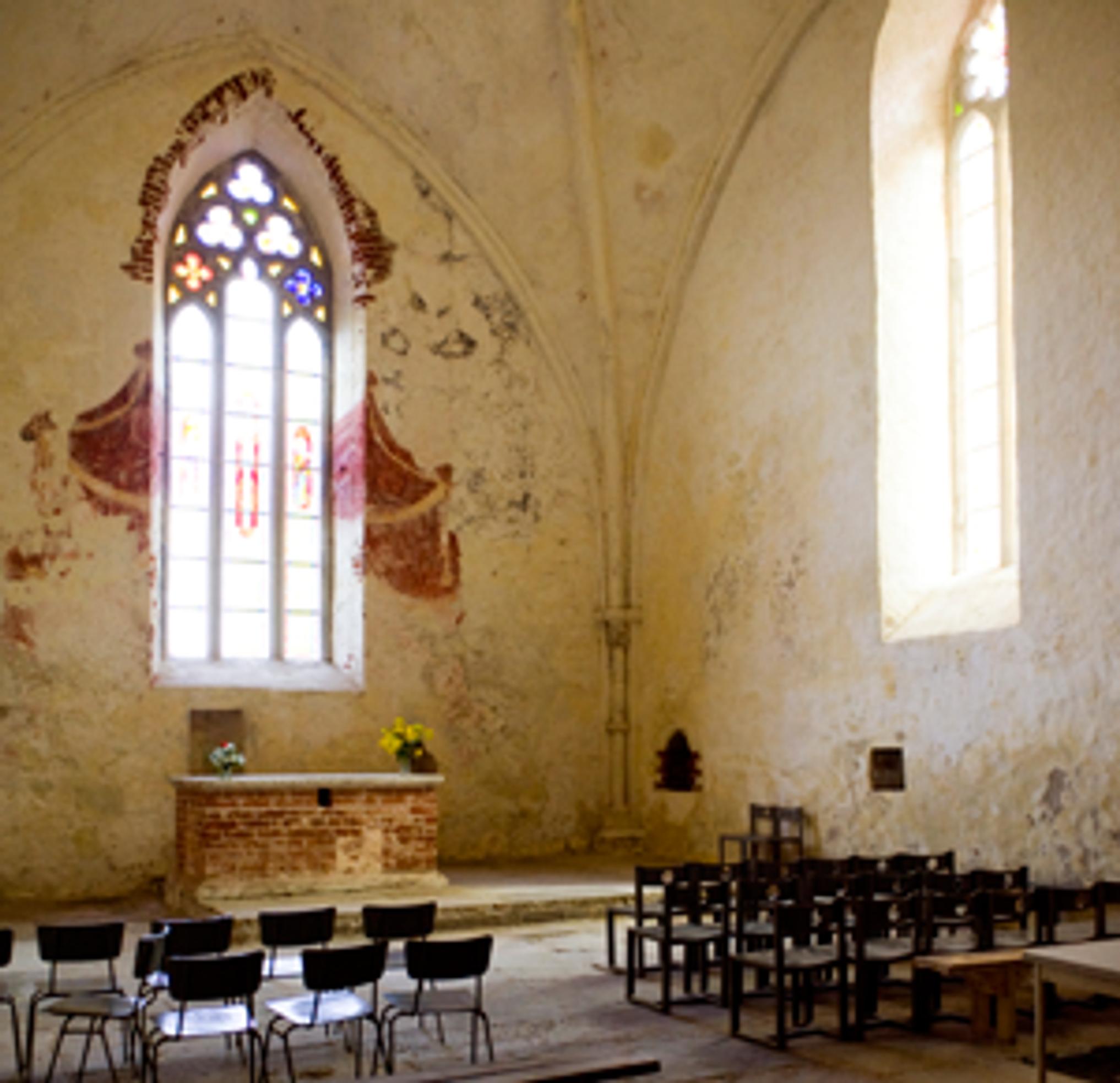 Kirkon seinillä on freskojen hahmotelmia, mutta oikeita maalauksia ei näy. Nurkat ovat täynnä hometta, ja tilassa on kammottava kaiku.