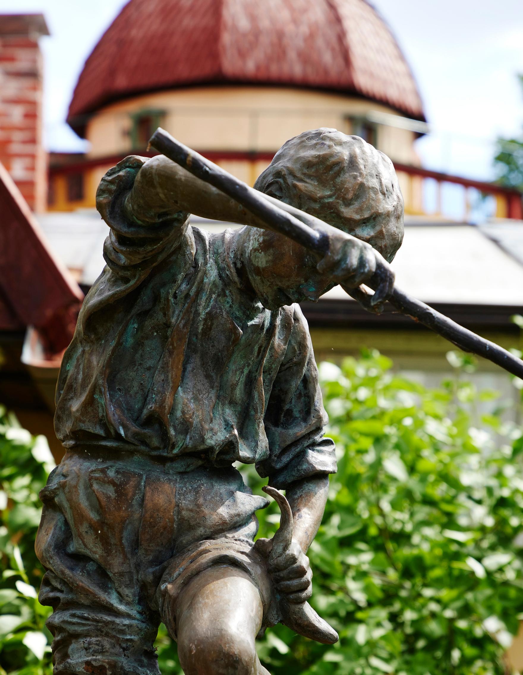 Suurin Visavuoressa valettu pronssiteos Onkipoika kalastelee ateljeen pihalla omassa allaslammikossaan.