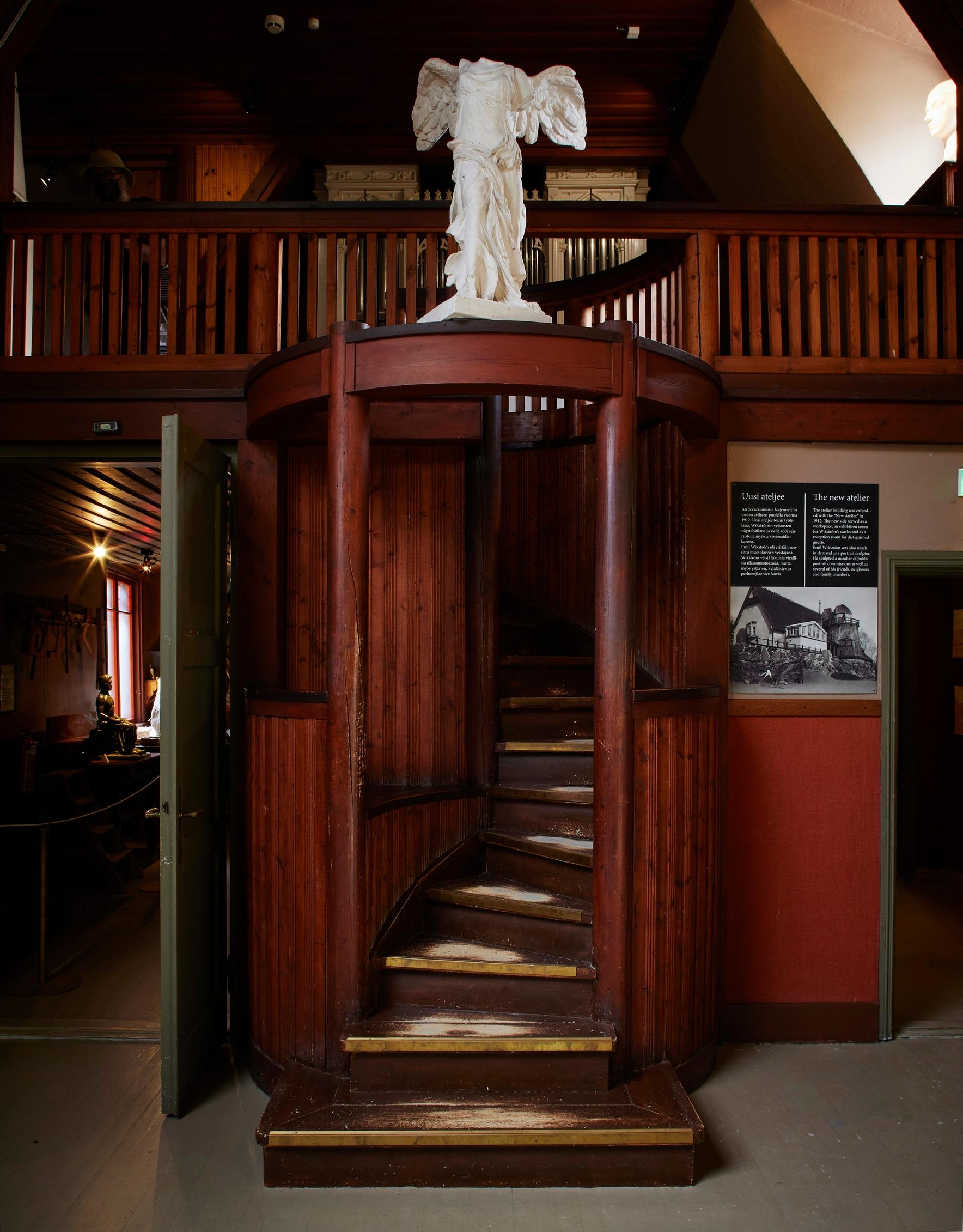 Varsinaiseen ateljeehen noustaan pitkät portaat, mutta talon takana kakkoskerros on maan tasassa.