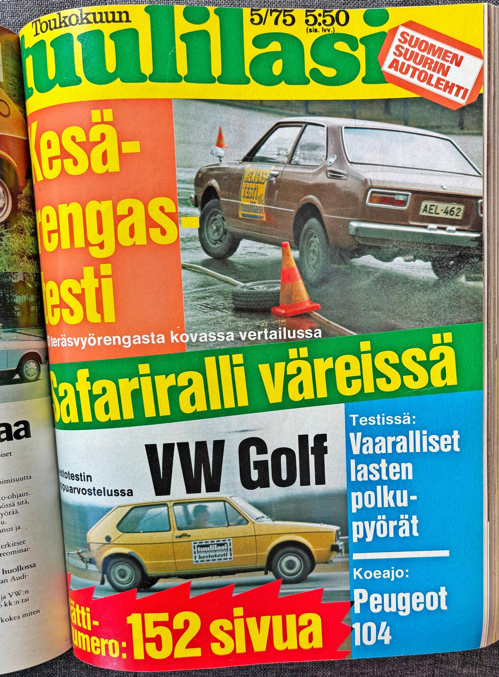 Toukokuun 1975 Tuulilasissa julkaistiin kesärengasvertailun tulokset. Mukaan oli otettu kymmenen uuden sukupolven modernia teräsvyörengasta kokoluokassa 155SR13. Aikamoisia pizzaleikkureita olivat autonrenkaat tuohon aikaan...