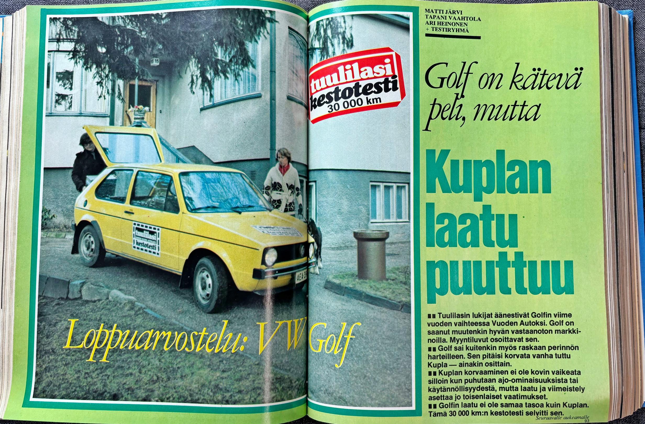 Vuonna 1974 markkinoille tullut, jo vanhentuneen Kuplan seuraajaksi kaavailtu Volkswagen Golf oli otettu Tuulilasin perusteelliseen, 30 000 kilometrin kestotestiin lokakuussa. Ja nyt, puolisen vuotta myöhemmin, oli loppuraportin aika.