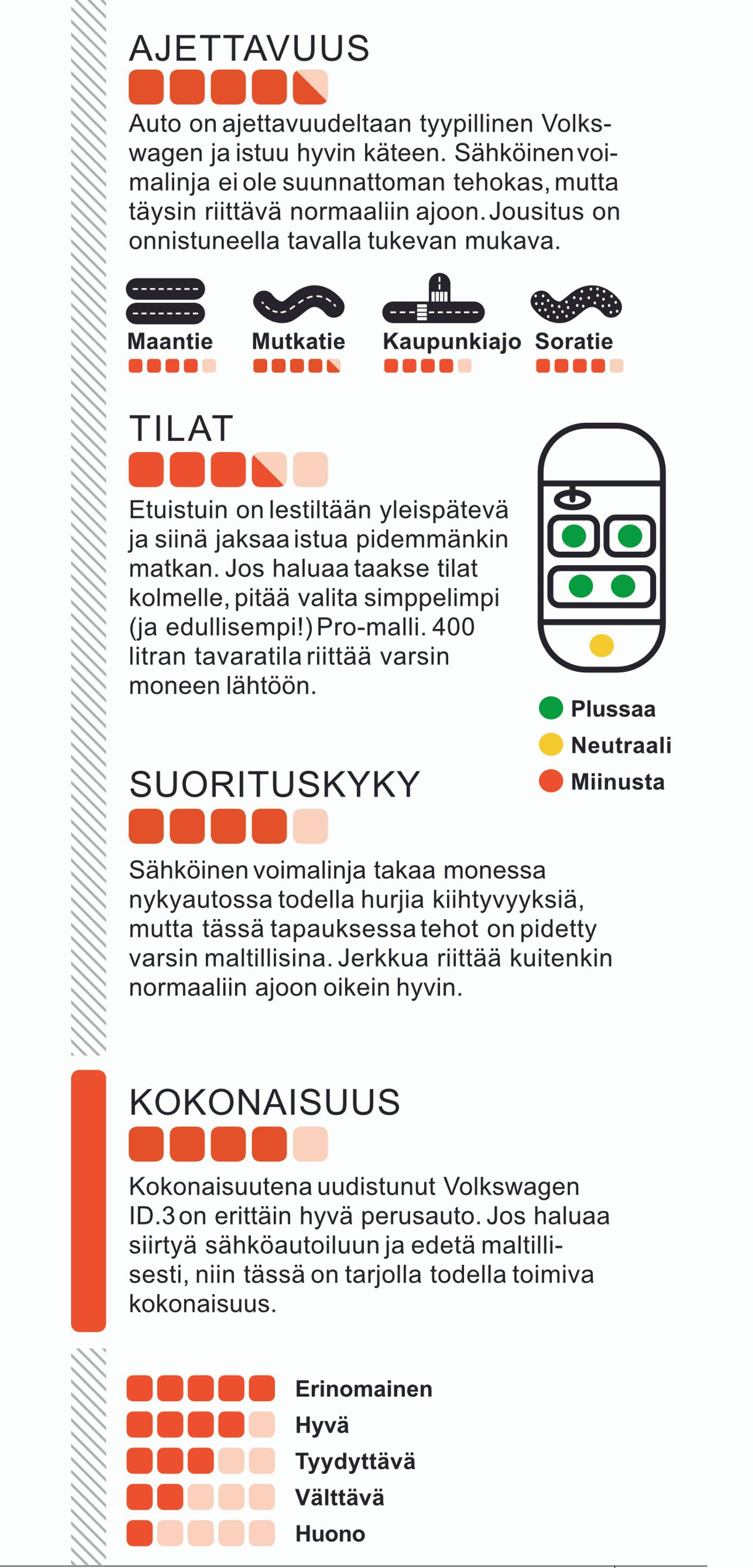 ID.3 on todella käytännöllinen sähköauto, sillä sähköisen voimalinjan puolesta se riittää moneksi ja tilaakin on riittävästi pienelle perheelle. Laatuvaikutelma on kohdallaan.