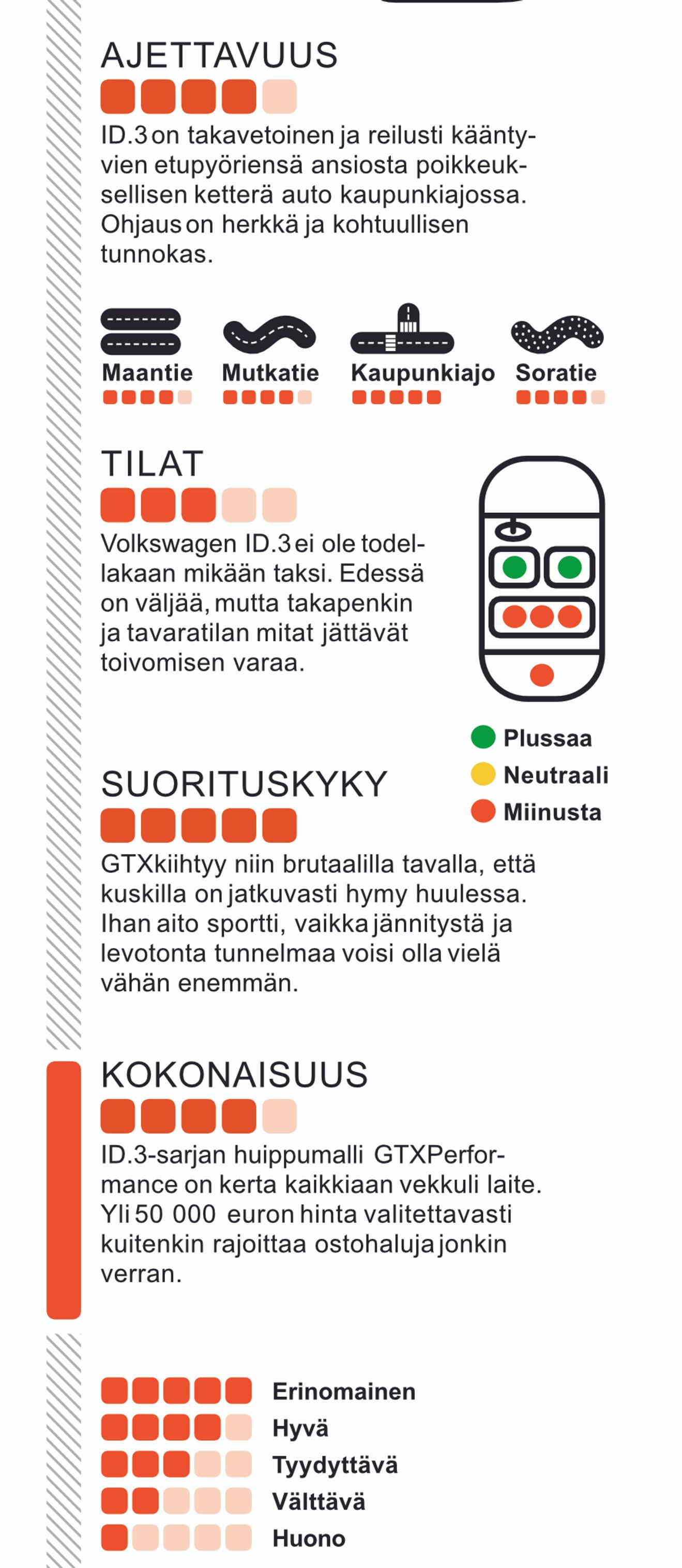 ID.3-sarjan huippumalli GTX Performance on kerta kaikkiaan vekkuli laite. Yli 50 000 euron hinta valitettavasti kuitenkin rajoittaa ostohaluja jonkin verran.