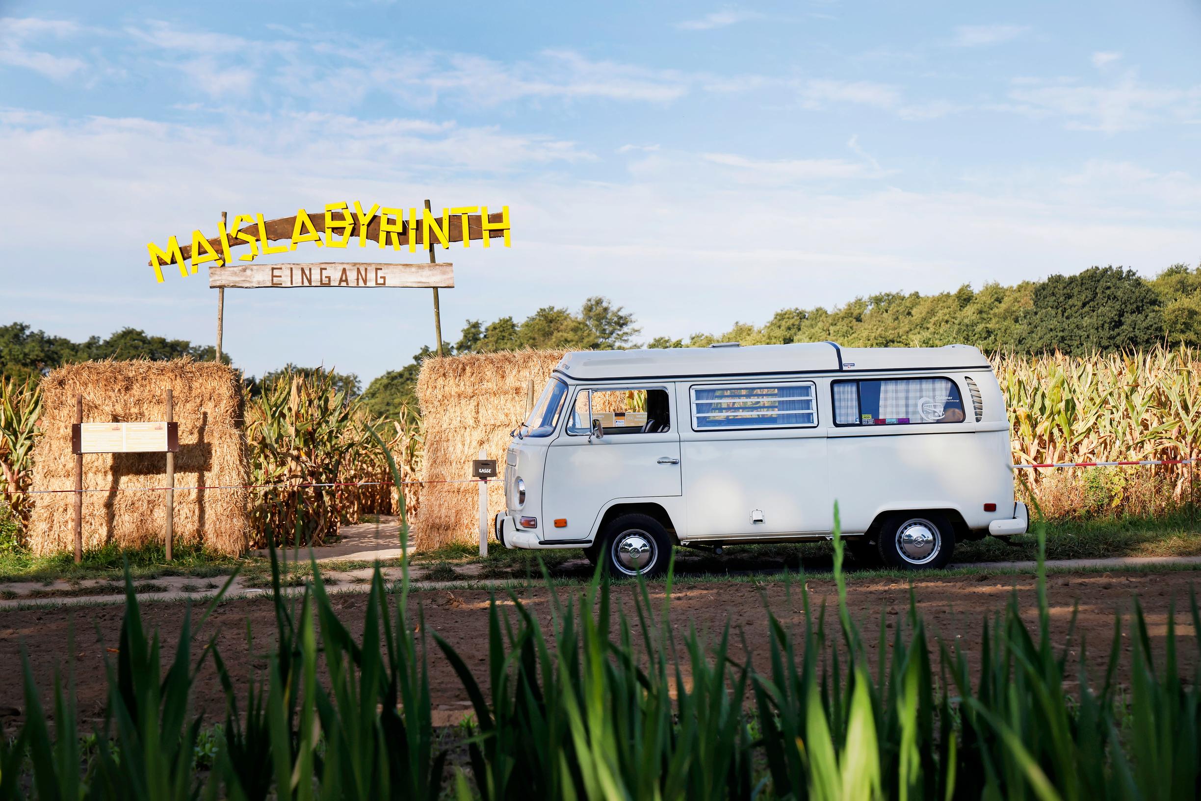 Ah, pallokeula. Volkswagen T2a vuosikertaa 1971 ja vielä Westfalia-malli, eli varustettu nostettavalla katolla! Saimme tämän upean, aikoinaan USA:han viedyn ja sittemmin sieltä takaisin Saksaan palanneen, yksilön lainaan Hannoverissa sijaitsevasta VW:n hyötyajoneuvojen klassikkokeskuksesta. Sieltä sen saa halutessaan vuokralle kuka vain. Erilaisia autoyksilöitä eri sukupolvista on tarjolla joka lähtöön.