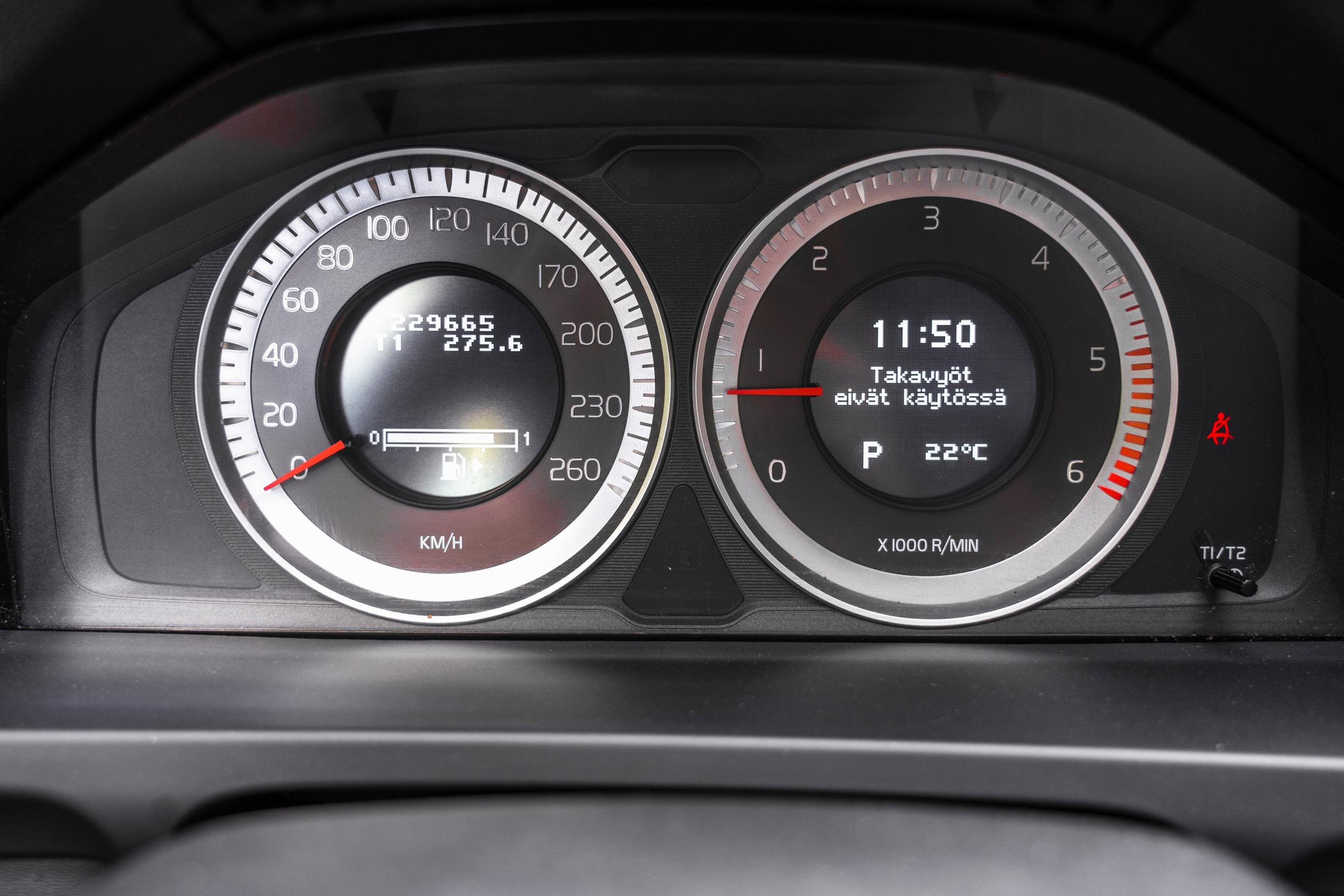 Kurkistus sisätiloihin tuotti iloisen yllätyksen, sillä Volvossa oli poikkeuksellisen aistikas, okran sävyinen nahkaverhoilu. Kuskin istuimessa oli tyyliin sopivasti sähkösäädöt, joiden avulla sopiva ajoasento löytyi käden käänteessä. Viisipyttyisen Volvon käynnistäminen on aina ilo, sillä nämä koneet laulavat mukavan rytmikkäästi. Kiehtova äänimaailma ei ole pelkkää silmänlumetta, sillä tämä turbodiesel vie Volvoa voimalla alakierroksilta lähtien. Koeajoautossa oli automaattivaihteisto, joka sopi hienosti tymäkän moottorin pariksi.