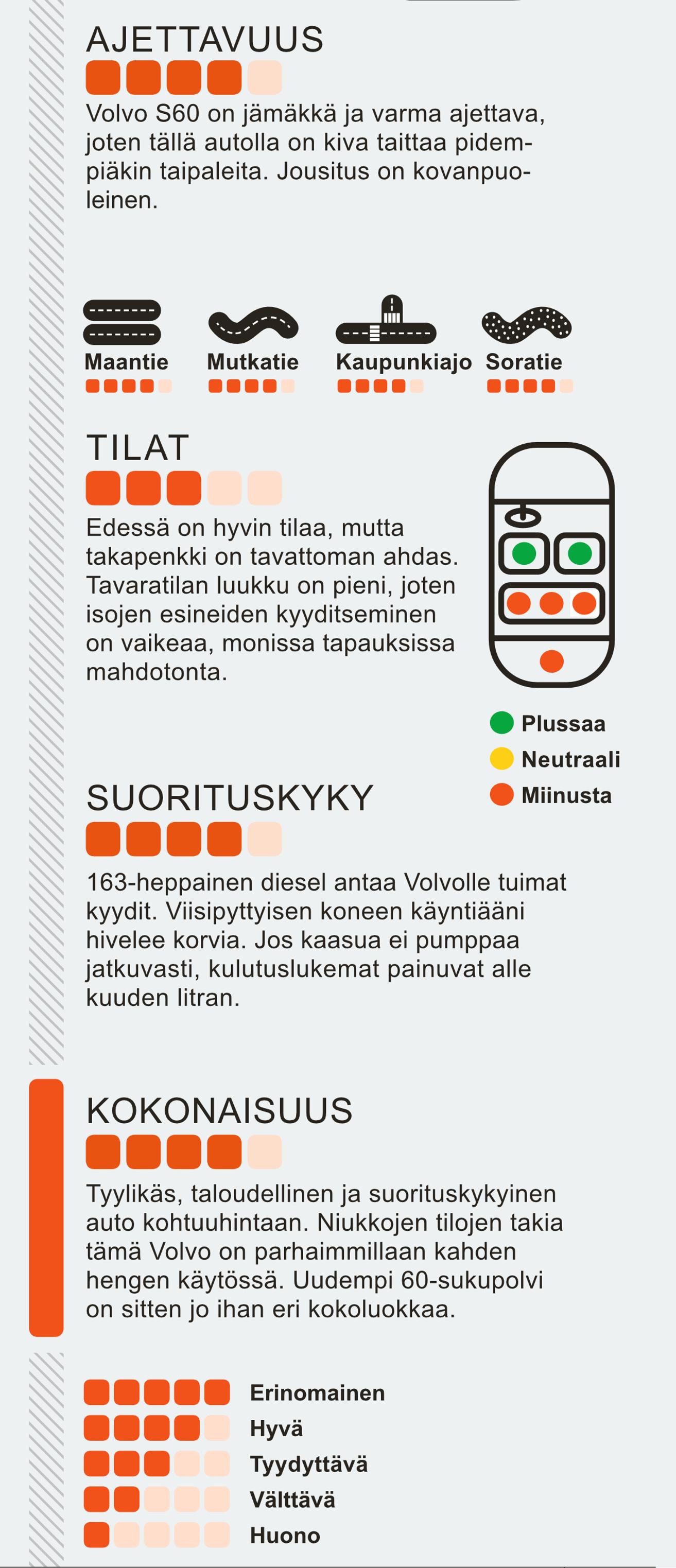 Lähdimme sedan-jahtiin avoimella mielellä. Haussa oli vaikkapa 3-sarjan Bemu tai C-Mersu. Lopulta ajoon valikoitui Volvo S60 vuodelta 2012. Tämä auto edustaa Kuuskymppisen toista sukupolvea. Malli oli aikanaan erittäin suosittu, ja niinpä vaihdokkeja on tarjolla pilvin pimein. Koeajoyksilömme oli tyyppiä D3. Tämä koodi tarkoitti kymmenen vuotta sitten viisipyttyistä ja kaksilitraista moottoria. Kone tuottaa rapsakat 163 hevosvoimaa.