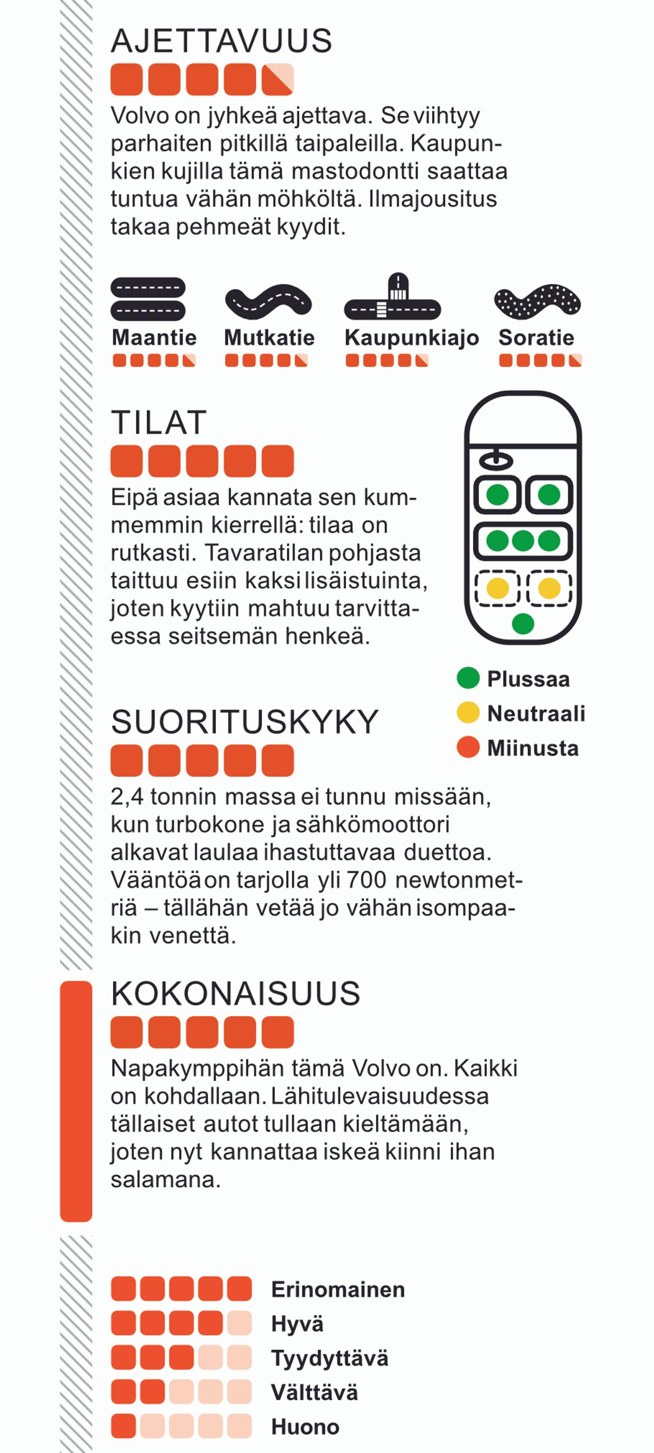 T8 on Volvon slangia, ja yleiskielelle käännettynä se tarkoittaa, että tehoa on. Kaksilitraisen turbokoneen ja sitä komppaavan sähkömoottorin yhteisteho on peräti 455 hevosvoimaa. Myös vääntö on rahtaritasoa: 709 Nm. Paukkua pitää tietysti ollakin, sillä tämä pikku keijukainen painaa rapsakat 2,4 tonnia.