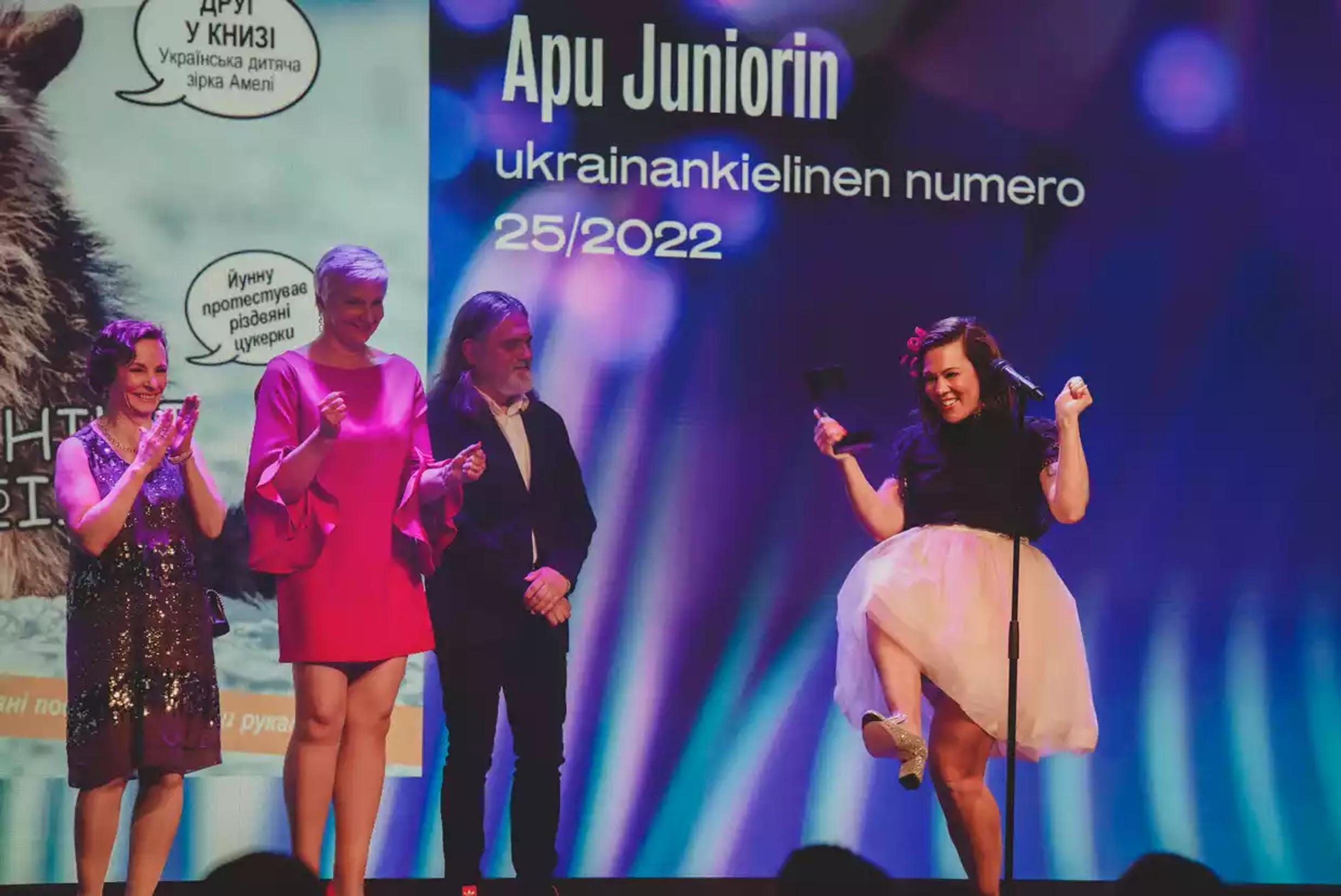 Apu Juniorin tiimi teki lehden yhdestä numerosta ukrainankielisen version, jota jaettiin SOS-Lapsikylän kautta sotaa Suomeen paenneille alakoululaisille. Raati perustelee palkintoa näin: